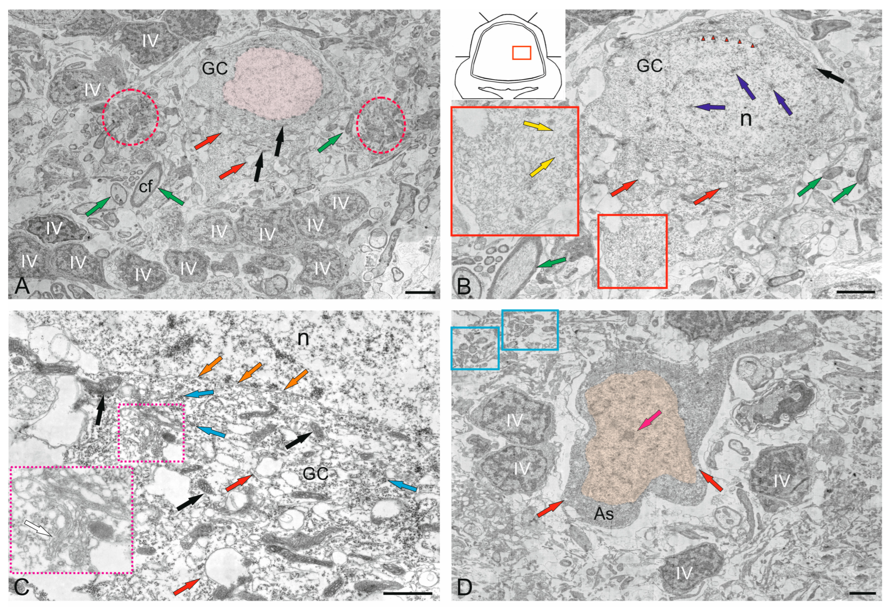 Large astrocytes (10.69 ± 0.43 by 4.33 ± 0.26 μm) were found at the border of the GL and GrL (Figure 13A). These astrocytes had a large, jagged nucleus (Figure 13A,B) and dense cytoplasm with a developed protein-synthesizing complex of ribosomes and numerous mitochondria. Multiple processes extended from the astrocyte body, some reaching considerable length (2.5 μm) and diameter (150 nm) (Figure 13A). At one of the astrocyte poles, the processes surrounded membrane-bound vesicles, measuring 250–300 nm in diameter (Figure 13A), and formed endocytic complexes (Figure 13A, green inset). Since endocytic patterns were detected in the area of astrocyte–neuron junction, we do not rule out the possibility that this type of astrocyte is specialized in the elimination and utilization of damaged neurons. Astrocytes of this type formed contacts with cfs (Figure 13A, magenta arrowheads). Zones of secretory granules were detected near the astrocytes (Figure 13A, red dotted rectangle). Their granular content could be extracellular glutamate, which the astrocytes absorb for neutralizing and converting into neutral glutamine. Similar patterns of extracellular glutamate utilization were also found in other areas of the GL and infraganglionic plexus (Figure 13C). Some astrocytes, in addition to processes with pseudopodial morphology, showed typical end-feet converging on myelinated fibers (Figure 13C, orange arrowhead). Overall, this type of astrocyte can be characterized as anti-inflammatory with endocytic activity.