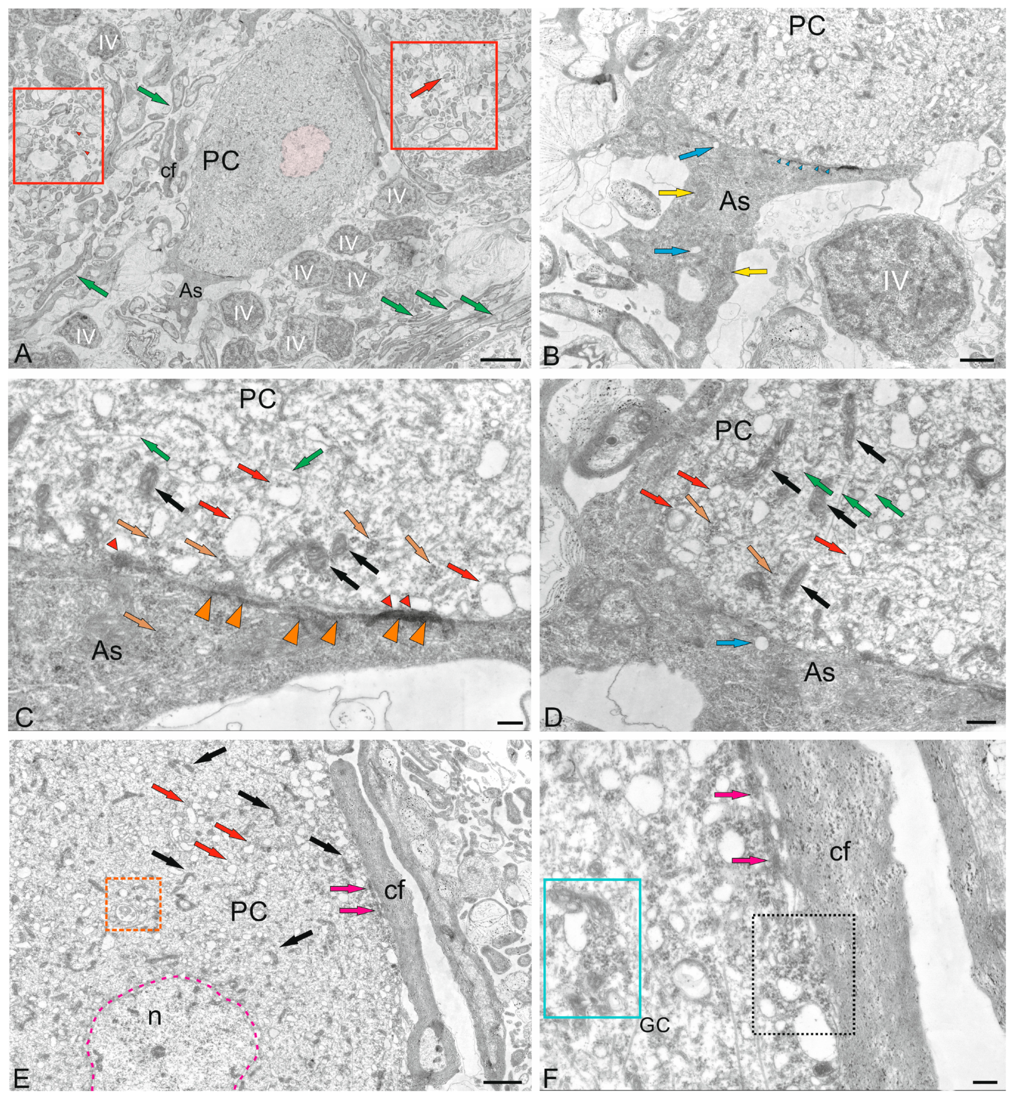 Figure 12. Ultrastructural organization of Purkinje cells in contact with astrocytes in the cerebellum of juvenile chum salmon, Oncorhynchus keta. (A)—Purkinje cell (PC) with nucleus (highlighted in pink) in contact with an astrocyte (As); type IV aNSPCs—IV; cf—climbing fibers (indicated by green arrows); red rectangles outline the patterns of sprouting fibers (indicated by a red arrow); extracellular glutamate granules are indicated by red arrowheads. (B)—Enlarged fragment of As containing rare vacuoles are indicated by blue arrows; mitochondria, by–yellow arrows; the area of contact with PC, by blue arrowheads, contact with As. (C)—Fragment of the contact between As and PC at higher magnification: PC vacuoles are indicated by red arrows; mitochondria, by black arrows; polyribosomes, by brown arrows; actin filaments, by green arrows; the area of contact with As, by red arrowheads (from the PC side) and orange arrowheads (from the As side). (D)—Fragment of the contact of As and the apical part of PC at higher magnification; vacuoles are indicated by blue arrows, other designations as in (C). (E)—Fragment of the contact of As and the basal part of PC at higher magnification: the area of contact of PC with cf is indicated by magenta arrows; the nucleus (n) is outlined by a magenta dotted line; the Golgi apparatus, by orange dotted rectangle; other designations are as in (C). (F)—Fragment of the contact of As and the basal part of PC shown in E at higher magnification; clusters of ribosomes near the plasma membrane are outlined by black dotted rectangle; clusters of ribosomes in the cytoplasm of PC, by blue rectangle; other designations are as in (E). TEM. Scale bars: (A)—3 µm; (B,E)—1 µm; (C,F)—200 nm; (D)—500 nm.