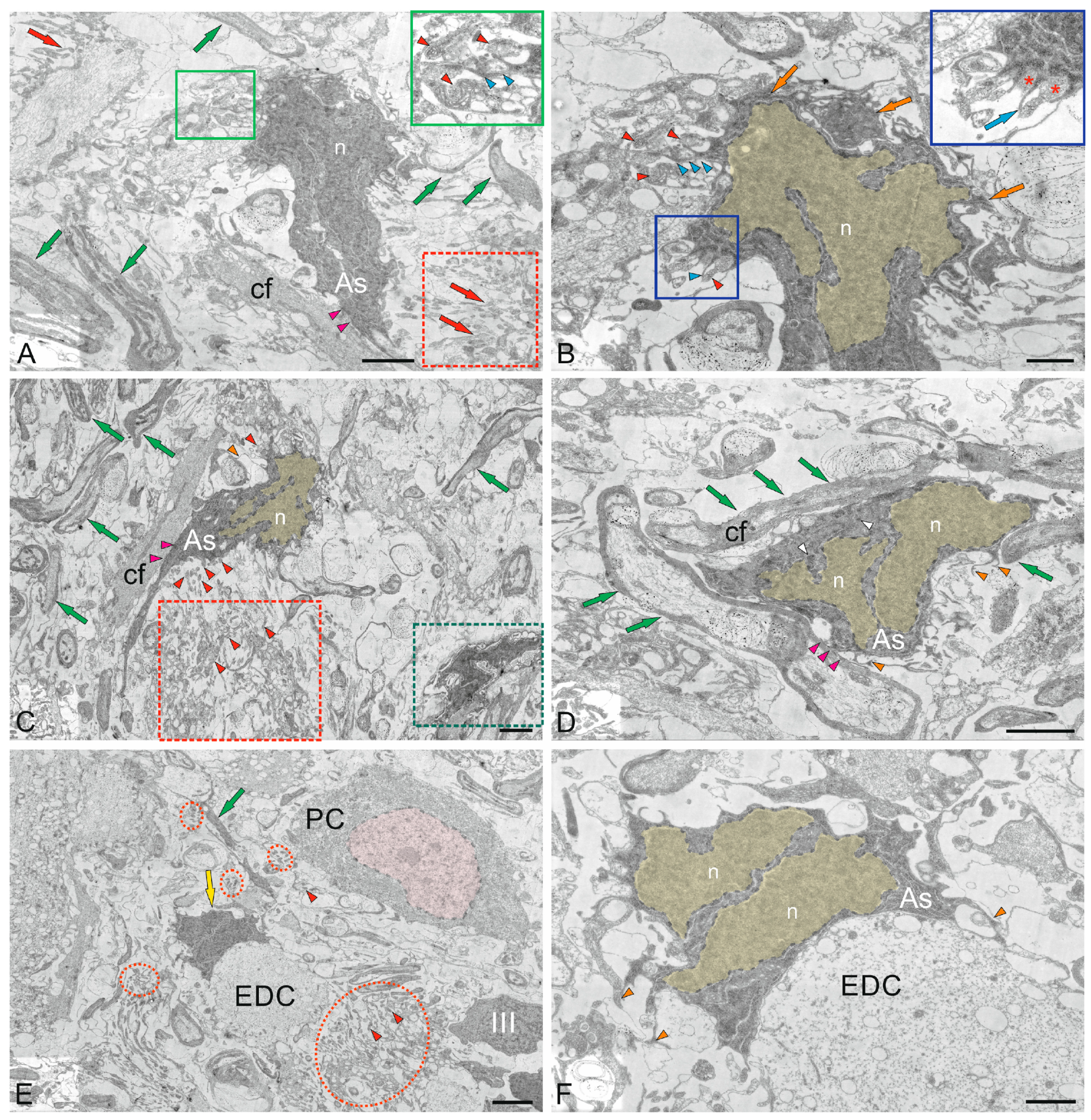 Figure 13. Ultrastructural organization of large astrocytes in contact with Purkinje cells in the cerebellum of juvenile chum salmon, Oncorhynchus keta. (A)—Large astrocytes located at the border of the GL and GrL: large jagged nucleus (n); inset in the green rectangle outlines astrocyte processes (blue arrowheads) surrounding membrane vesicles (red arrowheads), forming endocytic complexes; secretory granules (red arrows) are outlined by the red dotted square; fibers are indicated by green arrows; the contact zone of As and cf, by pink arrowheads. (B)—Enlarged fragment of As: nucleus (n) is highlighted in yellow; endocytosis is outlined by the blue inset; endocytic vesicle is indicated by red asterisk; astrocyte process is indicated by the blue arrow; As boundaries, by orange arrow; other designations are as in (A). (C)—Patterns of extracellular glutamate utilization by As: the irregularly shaped nucleus (n) is highlighted in yellow; the contact zone with cf is indicated by magenta arrowheads; the end-feet of As, by an orange arrowhead; glutamate vesicles are outlined by the red dotted rectangle; the vesicles are indicated by red arrowheads; the apoptotic cell is outlined by the green dotted rectangle. (D)—Fibrous-type As localized among myelinated cf (green arrows), forming tangential contacts, is indicated by magenta arrowheads; the irregularly shaped nucleus is highlighted in yellow; mitochondria are indicated by white arrowheads; the end-feet of As, by an orange arrowhead. (E)—Astrocytes (yellow arrow) in contact with the EDC: the PC nucleus is highlighted in pink; an accumulation of secretory granules (red arrowheads) is outlined by red dotted oval; type III aNSPCs—III. (F)—An enlarged fragment of As: the double nucleus is highlighted in yellow; the end-feet of As is indicated by orange arrowhead. TEM. Scale bars: (A,C,D)—2 µm; (B,F)—1 µm; (E)—3 µm.