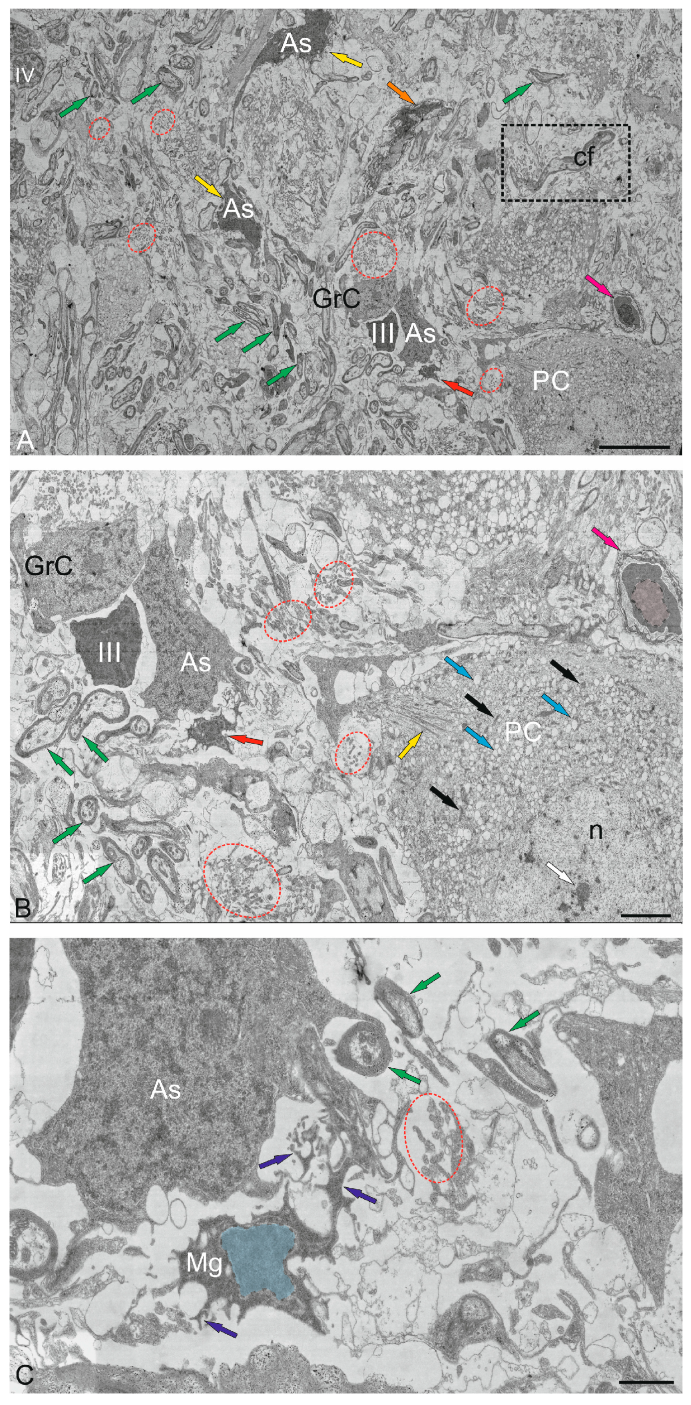 In the GL, we also identified several astrocytes surrounding the PCs (Figure 9A). Such astrocytes were small in size (Table 1), with short, thick processes, dense cytoplasm, and an irregularly shaped nucleus (Figure 9A). Some astrocytes had two irregularly shaped nuclei per cell (Figure 9A).