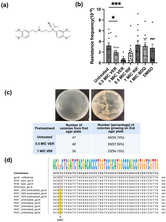 Verapamil reduces moxifloxacin resistance frequency in M. smegmatis. (a) Structure formula of verapamil. (b) Effect of verapamil (VER), bedaquiline (BDQ) and rifampicin (RIF) on the frequency of resistance to moxifloxacin in M. smegmatis. The bacteria were pretreated with the drugs (or DMSO/water control) for 48 h and subsequently transferred to agar plates containing moxifloxacin at 2 × MIC. Four biological replicates were used for each sample. Significance for verapamil was calculated vs. untreated (water), and for bedaquiline and rifampicin vs. DMSO, using unpaired one-tailed t-tests. Data represent mean ± SEM (*: p < 0.05, ***: p < 0.001). (c) Test for transient resistance versus mutation-based resistance. Bacteria were transferred from colonies on the first agar plate (2x MIC moxifloxacin) to a new agar plate containing moxifloxacin at 2x MIC. A representative streak on the second agar plate (upper panel) and the (relative) number of colonies growing on the second agar plate (lower panel) are shown. (d) DNA sequencing of the gyrA gene for moxifloxacin-resistant colonies. gyrA reference: gyrA sequence in NCBI database; wild type_gyrA: M. smegmatis growing on plate without moxifloxacin; MXFr_VER-pretreated_gyrA: M. smegmatis colonies pretreated with verapamil growing on agar plate with moxifloxacin at 2x MIC; MXFr_Untreated_gyrA: untreated M. smegmatis growing on agar plate with moxifloxacin at 2x MIC. The C → T changes are marked with red rectangles, and the altered nucleotides in moxifloxacin-resistant colonies are highlighted in yellow.
