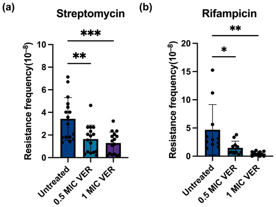 Subsequently, we investigated whether the observed decrease in the resistance frequency caused by verapamil is specific for moxifloxacin or if it represents a broader phenomenon. We tested two additional antibiotics with different mechanisms of action: streptomycin, which inhibits ribosomal protein synthesis [28], and the RNA polymerase inhibitor rifampicin [25]. The same workflow was applied as described above for evaluation of resistance against moxifloxacin. We determined the MIC for rifampicin to 5 μg/mL, and streptomycin to 0.25~0.5 μg/mL, comparable to published values [29,30,31,32,33]. A series of rifampicin and streptomycin concentrations on the agar plate was tested (Table S1). Concentrations of eight-fold MIC and two-fold MIC were chosen for further experimentation with rifampicin and streptomycin, respectively, as these concentrations yielded well countable numbers of colonies. We calculated the resistance frequency for rifampicin to 2.70 × 10−8 and for streptomycin to 1.82 × 10−8, close to published mutation frequency ranges [34,35]. After verapamil pretreatment, the number of colonies resistant to rifampicin or streptomycin (Figure S1c,d) as well as the resistance frequency for both streptomycin and rifampicin significantly declined (Figure 2). These results suggest that verapamil exhibits a broad effect, interfering with the development of resistance across different classes of antibiotics.