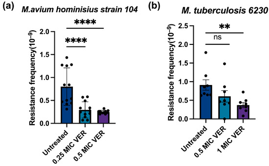 To assess the clinical relevance of our findings, we investigated whether the effect of verapamil on the development of resistance found above for M. smegmatis is an idiosyncratic property of this fast-growing mycobacterium or if it extends to slow-growing and pathogenic mycobacterial species. We tested M. avium hominisius strain 104, a slow-growing nontuberculous bacterium causing pulmonary disease [2,36], and M. tuberculosis strain mc26230 (ΔRD1ΔpanCD) [37], an auxotroph mutant of the pathogenic laboratory strain M. tuberculosis H37Rv. As observed above for M. smegmatis, we found that pretreatment with verapamil significantly decreased the resistance frequency in M. avium and in M. tuberculosis (Figure 3a,b). A concentration-dependent reduction in resistant colony numbers was also observed (Figure S3). These results indicate that verapamil can suppress development of antimicrobial resistance in both fast-growing and slow-growing, non-pathogenic and pathogenic mycobacteria. This cross-species efficacy may substantially enhance the potential of verapamil as an adjunctive therapy in clinical settings for combating drug-resistant tuberculosis and other mycobacterial infections.