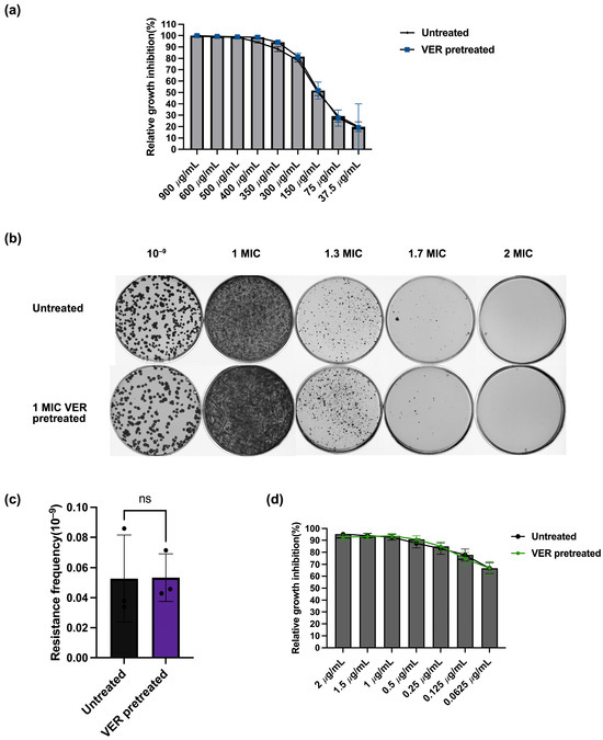 The development of resistance for one drug can lead to enhanced sensitivity for a second, unrelated drug, a phenomenon known as collateral sensitivity. Collateral sensitivity has been found in mycobacteria and can potentially be exploited to optimize drug combination regimen [38]. We investigated if collateral sensitivity might explain the decreased resistance frequency found above upon verapamil pretreatment. During verapamil pretreatment, M. smegmatis may develop resistance to verapamil; however, these verapamil-resistant bacteria may be more susceptible to other antibiotics. To test whether verapamil pretreatment induced verapamil resistance, we determined the sensitivity for verapamil before and after the verapamil pretreatment. The result showed no difference in growth inhibition by verapamil between the untreated sample and the verapamil-pretreated sample (Figure 4a). In line with this finding, we observed no difference in colony numbers between the verapamil-pretreated sample and the untreated control bacteria on agar plates containing 1.7 × MIC verapamil, and no colonies were observed on agar plates containing verapamil at 2 × MIC (Figure 4b,c). These results show that verapamil pretreatment did not trigger resistance to verapamil. To further evaluate whether verapamil pretreatment altered bacterial sensitivity to other antibiotics, we tested the growth inhibition of the verapamil-pretreated sample by the three investigated antibiotics. The observed susceptibility did not differ from the susceptibility determined for the untreated controls (Figure 4d and Figure S4). Taken together, it seems highly unlikely that the observed decrease in resistance frequency after verapamil pretreatment is due to collateral sensitivity with the tested antibacterials and instead is likely caused by a decrease in mutation rate.