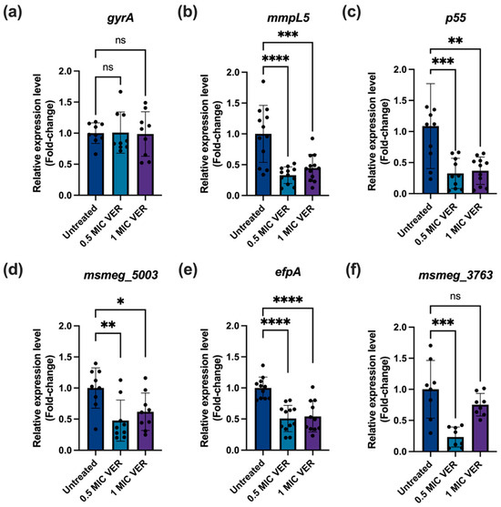 Verapamil decreases efflux pump expression in M. smegmatis. The bacteria were treated with verapamil at the indicated concentrations for 48 h and, subsequently, mRNA levels were quantified by qPCR, normalized to sigA as a reference gene. (a) Expression of the gyrA gene as control. (b–f) The relative expression levels of the selected efflux pump genes: mmpL5 (msmeg_1382), p55 (msmeg_3069), Tap locus (msmeg_5003), efpA (msmeg_2619), and msmeg_3763, respectively. Three biological replicates were used for each sample, data represent mean ± SD, and significance was shown for comparison to the untreated sample as tested by a one-way ANOVA with Dunnett test for multiple comparisons (ns: not significant, *: p < 0.05, **: p < 0.01, ***: p < 0.001, ****: p < 0.0001).