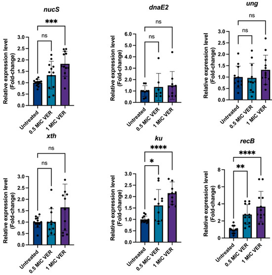 Next, we tested if verapamil could modulate DNA repair mechanisms. Mycobacteria lack the MutS/MutL mismatch repair system of E. coli; instead, NucS functions as the primary mismatch repair protein regulating mutation rates and, thereby, resistance levels [44,45,46,47]. Therefore, we employed qPCR to assess if the decreased resistance frequency observed upon treatment with verapamil correlates with the enhanced expression level of nucS. While the presence of verapamil did not change nucS levels after 48 h (Figure S5), we found significant, 1.83-fold nucS induction after 24 h of treatment with verapamil at 1 × MIC (Figure 6). Next to nucS, genes encoding the double strand repair proteins Ku and RecB [48] were both induced in the presence of verapamil (Figure 6). Other investigated DNA repair system genes, such as dnaE2, ung, and xth remained unaffected by verapamil treatment. Taken together, treatment with verapamil, at concentrations that decrease the resistance frequency to antibacterials, indeed triggers downregulation of efflux pumps and induces the expression of several DNA repair genes in M. smegmatis.