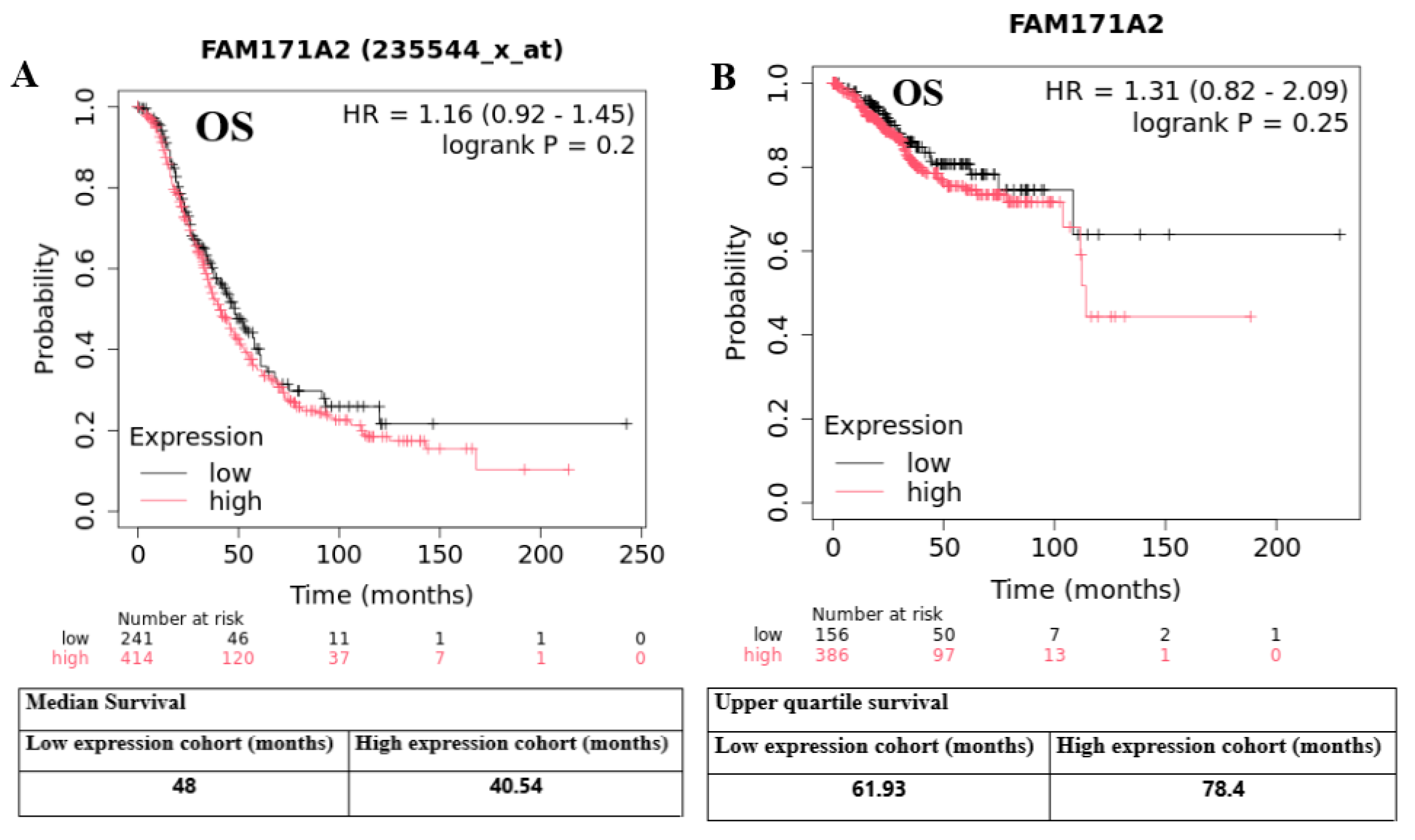 2.4. Kaplan–Meier Survival Analysis of FAM171A2 in UCEC and OV