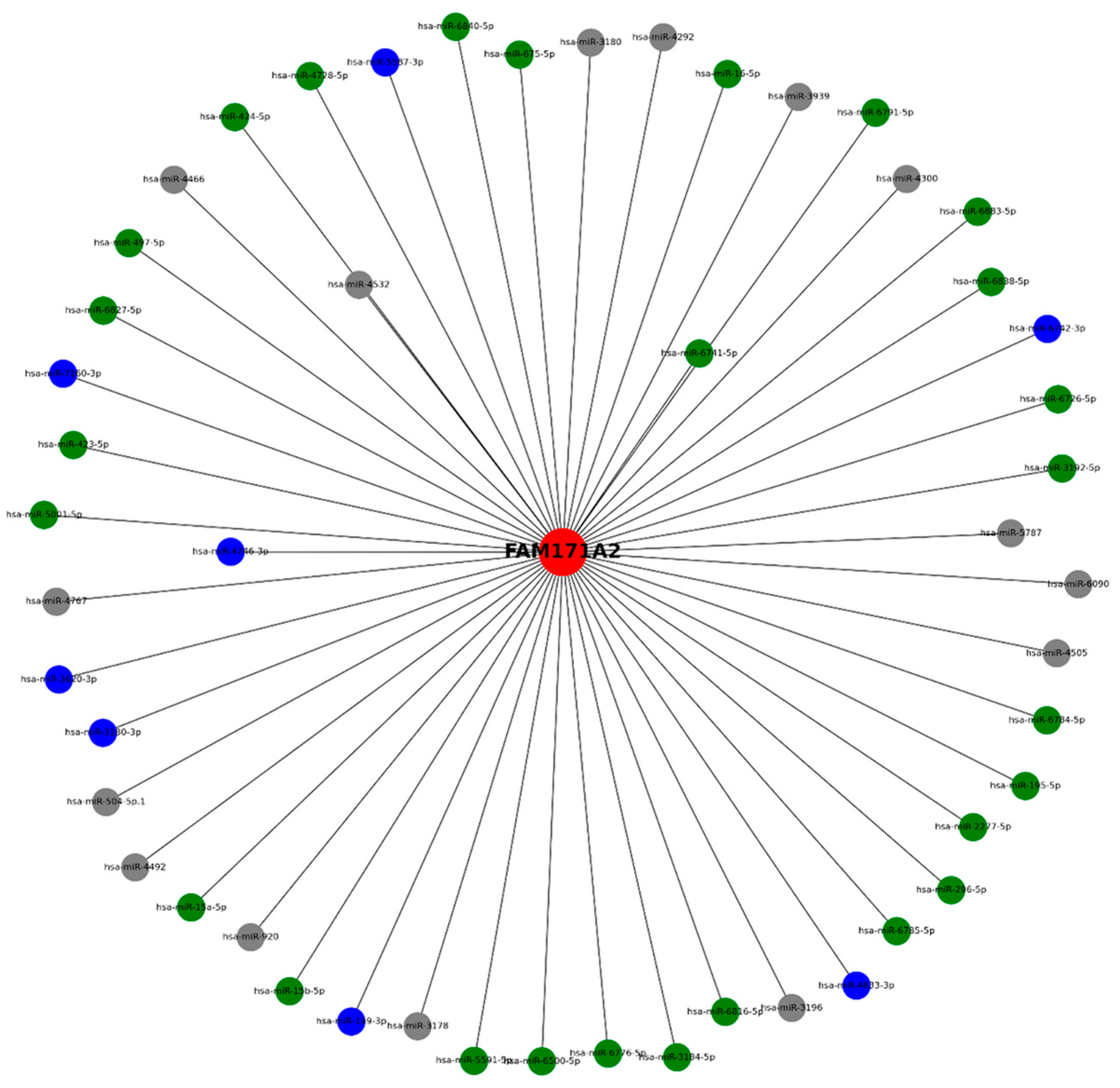 2.5. Network Visualization of FAM171A2 and Its Associated miRNAs