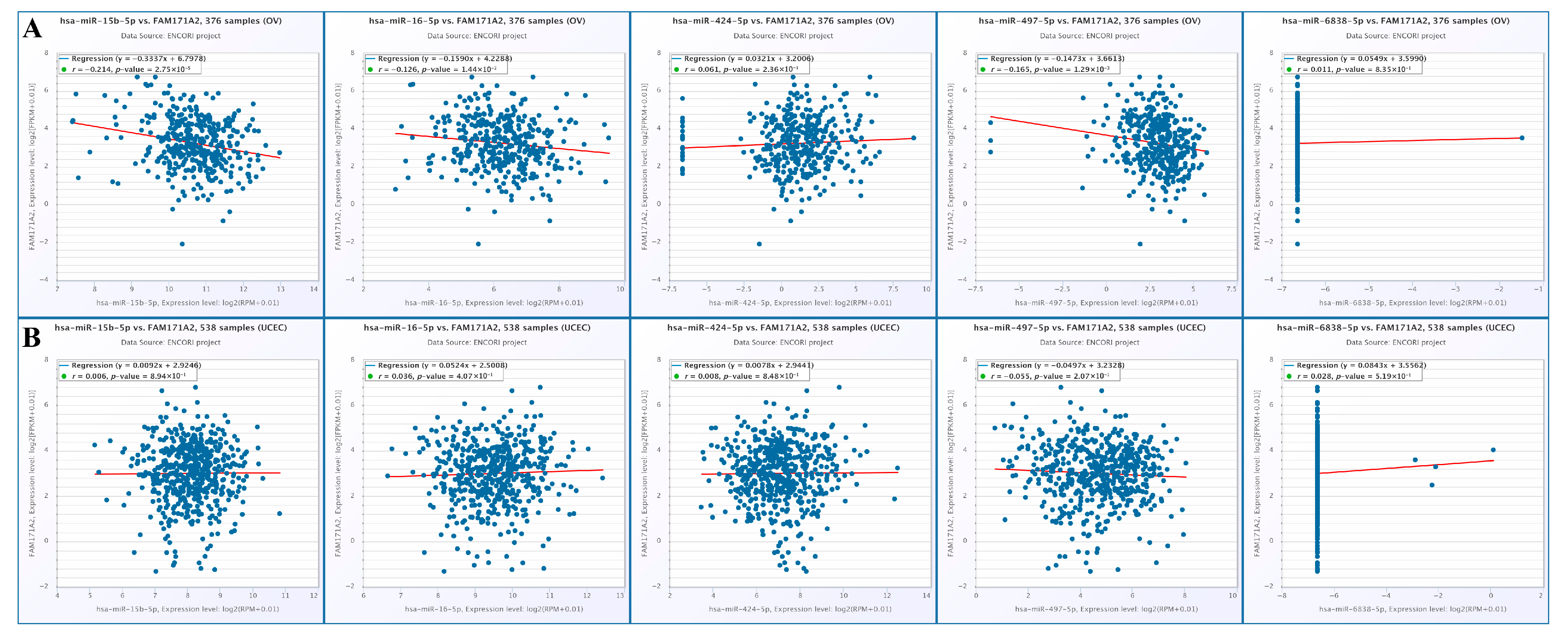 2.10.1. Correlation Analysis of FAM171A2 Expression with Selected miRNAs in OV