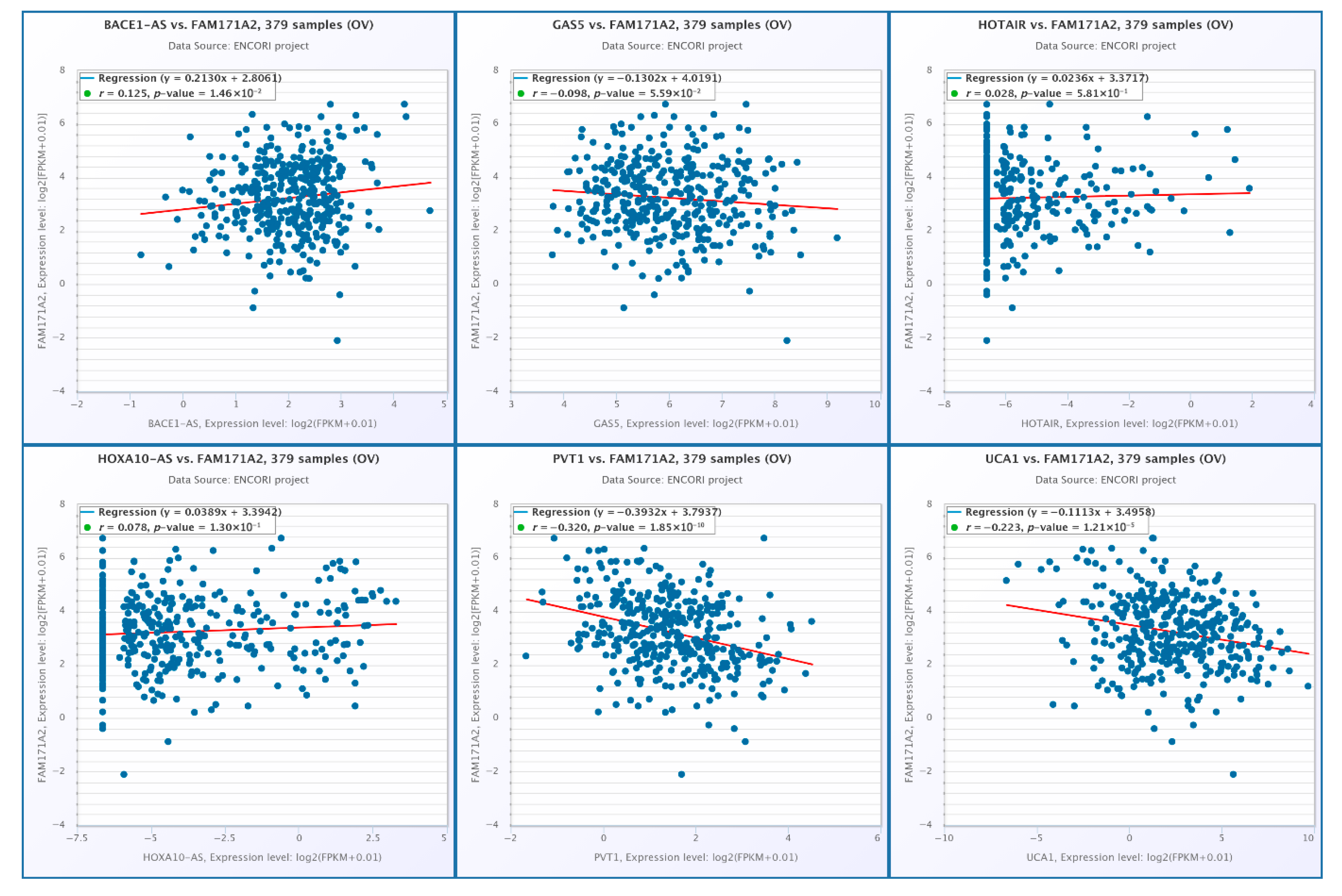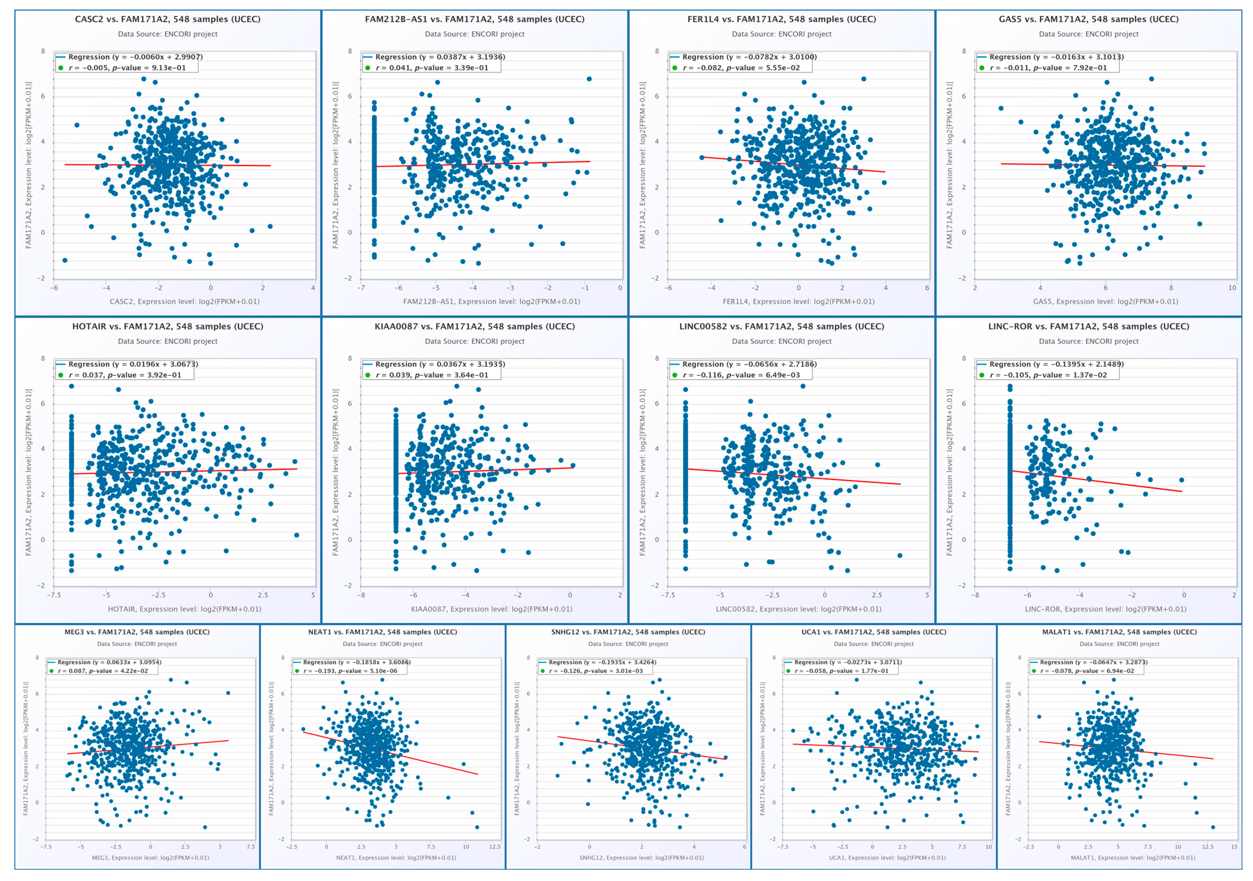 2.10. Correlation Analysis of FAM171A2 Expression with Selected lncRNAs at Across Gynecologic Cancer Cohorts