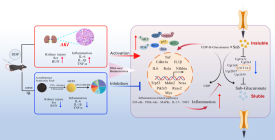 Han, L.; Tang, Z.; Ma, X.; Zhang, Q.; Han, Y.; Wang, Q.; Liu, J.; Bian, X.; Gao, L.; Xu, M.; et al. Integrative Transcriptomic and Metabolomic Analysis Reveals That Acanthopanax senticosus Fruit Ameliorates Cisplatin-Induced Acute Kidney Injury by Suppressing the NF-κB/PI3K-AKT Pathway via UGT1A1 Regulation. Int. J. Mol. Sci. 2025, 26, 11131. https://doi.org/10.3390/ijms262211131
