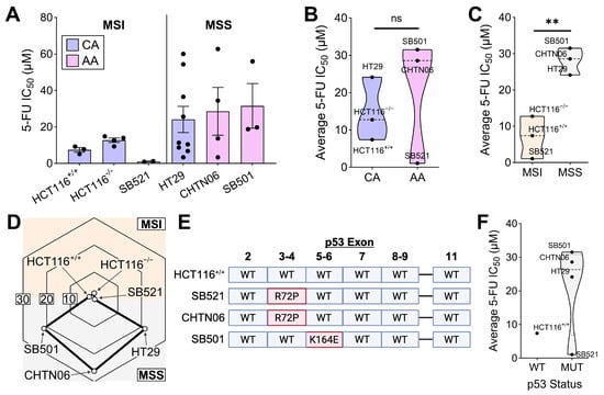 MSI status is a strong predictor of 5-FU sensitivity in both CA and AA CRC cell lines. (A) Indicated cell lines were treated with 5-FU for 72 h and MTT assay was performed. IC50 values for determined using 4−parameter regression, with each data point representing the IC50 value from an independent trial for each cell line (n = 3 to 9 replicate experiments per cell line). (B,C) Average 5-FU IC50 value for each cell line plotted by racial origin (B) and MSI status (C). (D) The standard deviation of 5-FU IC50 values across all independent trials for each cell line was plotted on a radar chart, with higher values on the periphery and lower values in the center. (E) The exons of p53 of the indicated cell lines were sequenced with Sanger sequencing, with mutation(s) displayed in red (Created in BioRender. Thaker, S. (2025) https://BioRender.com/wfs02yw). (F) Average 5-FU IC50 value for each cell line plotted by p53 status. ** p < 0.01.