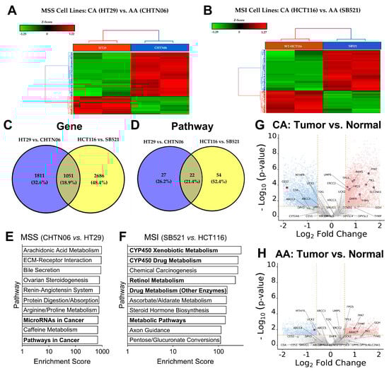MSI and racial origin have a layered impact on CRC transcriptomes, specifically on drug metabolism pathways. (A,B), Extracted RNA from indicated cell lines was analyzed with bulk RNA sequencing. Unsupervised hierarchical clustering of gene expression patterns was conducted for MSS cell lines (A) and MSI cell lines (B). (C,D), Layered analysis of gene expression made relative to respective AA cell line compared between MSI status at the individual gene level (C) and pathway enrichment level (D). (E,F), Pathway enrichment analysis showing top 10 differentially expressed pathways between AA and CA cell line within the MSS group (E) and the MSI group (F). (G,H), Gene expression of fluoropyrimidine metabolism pathway analyzed from our previously published RNAseq dataset [] comparing tumor vs. healthy adjacent tissue gene expression from CA (n = 20) (G) and AA (n = 20) (H) CRC tumors. Light blue dots are significantly downregulated genes, light red dots are significantly upregulated genes, and dark red dots with labels are genes belonging to the fluoropyrimidine metabolism pathway.