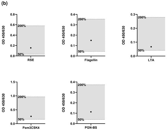 Results for the validation parameter Robustness. Spike recoveries of endotoxin and four non-endotoxin pyrogens (NEPs) assessed using two different HaemoMAT® kit lots: (a) Lot A and (b) Lot B. For each pyrogen (RSE, flagellin, LTA, Pam3CSK4, and PGN-BS), the OD signal of the spiked sample (●) was compared to the OD range defined by the 0.5× and 2× pyrogen standard concentrations. The acceptance range of 50–200% (0.5× and 2×) of the spike concentration is indicated by the shaded area.