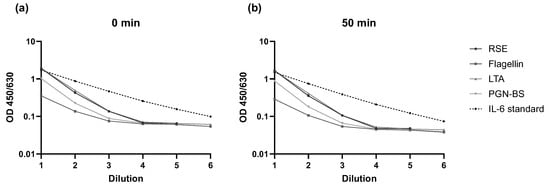 Results of the assessment of Robustness of IL-6 measurement over time. OD signals for each pyrogen (RSE, flagellin, LTA, Pam3CSK4, and PGN-BS) and IL-6 at (a) 0 min and (b) 50 min after addition of the stop solution in relation to respective dilutions are shown.