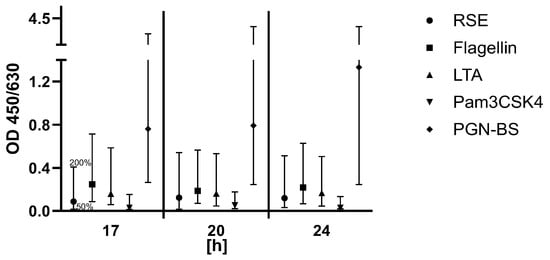 According to the manufacturer’s instructions, the stimulation time of the PBMCs must be 18 ± 1 h at 37 °C. To identify how the stimulation time affects the signal, the stimulation time of PBMCs was intentionally varied in timesteps of 17 h, 20 h, and 24 h. The signals of samples with and without the spikes of five pyrogens in total were examined in relation to the dilution series of the RSE. The PBMCs were thawed, diluted in cell culture medium and pooled. The cells were subsequently transferred into separate cell culture plates and analyzed at their distinct time points. The purpose of this experiment was to find the maximum stimulation time where all acceptance criteria are still met. The specific acceptance criteria were the same as those for (i) lot-to-lot comparability. The signals of the pyrogen standard dilutions had to decrease gradually with increased dilution, and spike recovery had to be between the OD generated from 50% and 200% of the pyrogen and endotoxin concentration (Figure 4).