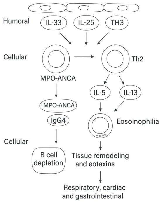 Building on the genetic framework, the immunopathogenesis of EGPA unfolds within a type 2–dominated inflammatory milieu. Epithelial alarmins such as thymic stromal lymphopoietin (TSLP), interleukin (IL)-33, and IL-25 amplify Th2 and ILC2 responses, promoting the production of IL-5 and IL-13, systemic eosinophilia, and eotaxin-mediated tissue recruitment (CCL11, CCL24, CCL26) [,,]. These cascades explain the strong respiratory tropism of the disease as well as the eosinophilic cardiac and gastrointestinal involvement characteristic of ANCA-negative EGPA [,].