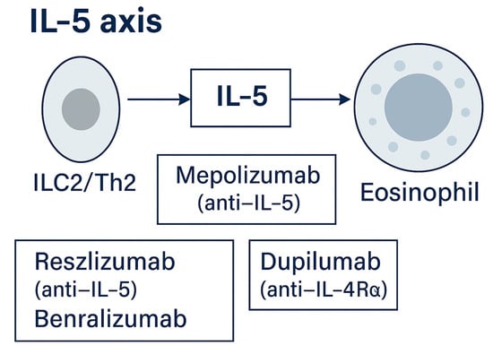 IL-5 axis. ILC2/Th2 cells produce IL-5, promoting eosinophil maturation and survival. Targeted therapies include mepolizumab and reslizumab (anti-IL-5) and benralizumab (anti-IL-5Rα) [,,,,]. Approved agents include mepolizumab (anti-IL-5) and benralizumab (anti-IL-5Rα: approved for EGPA based on MANDARA): reslizumab is used in selected off-label scenarios [,].