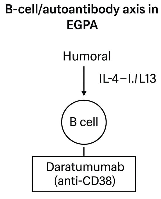 Beyond type 2 inflammation, B-cell dysregulation represents a central pathogenic axis in EGPA. The presence of anti-MPO ANCA, confined mainly to the vasculitic endotype, supports an autoantibody-mediated component responsible for glomerulonephritis, neuropathy, and purpura [,].