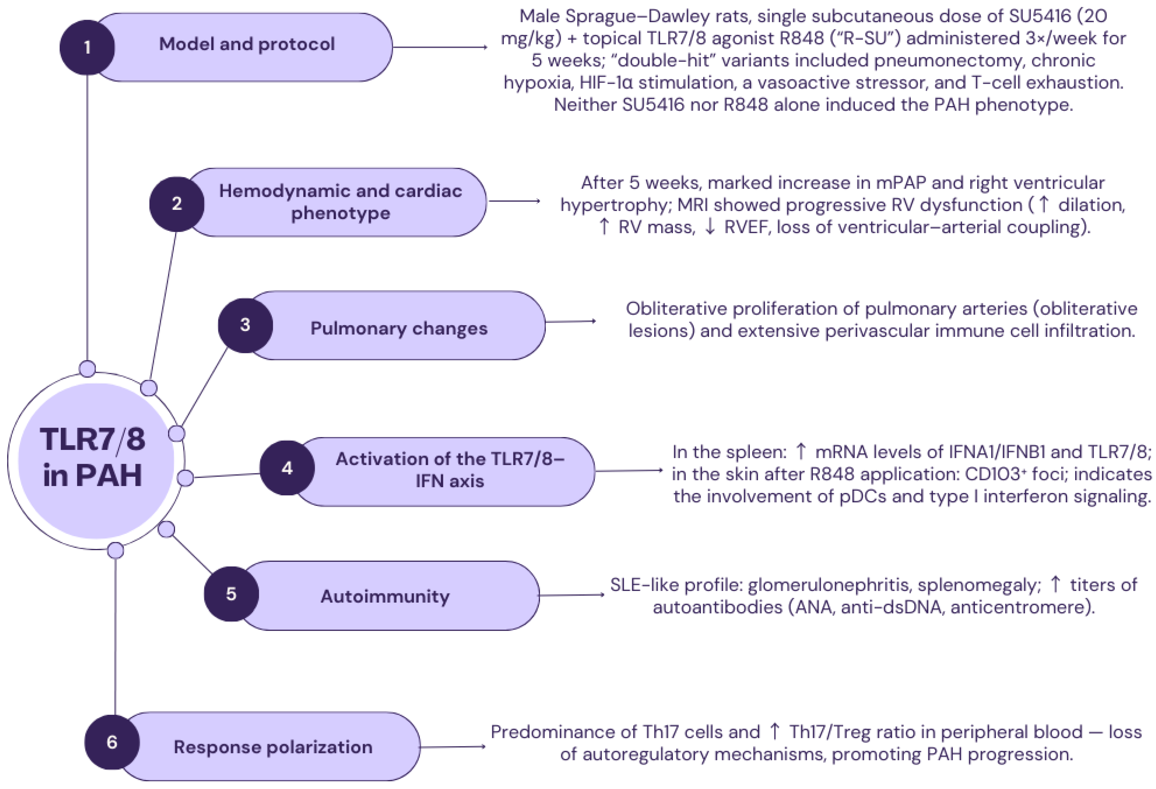 | Vascular/hemodynamic consequences | Potential involvement in the initiation and maintenance of inflammation affecting vascular remodeling | Increased vascular remodeling and inflammation; correlation with severity and deterioration of right ventricular function in animal models |