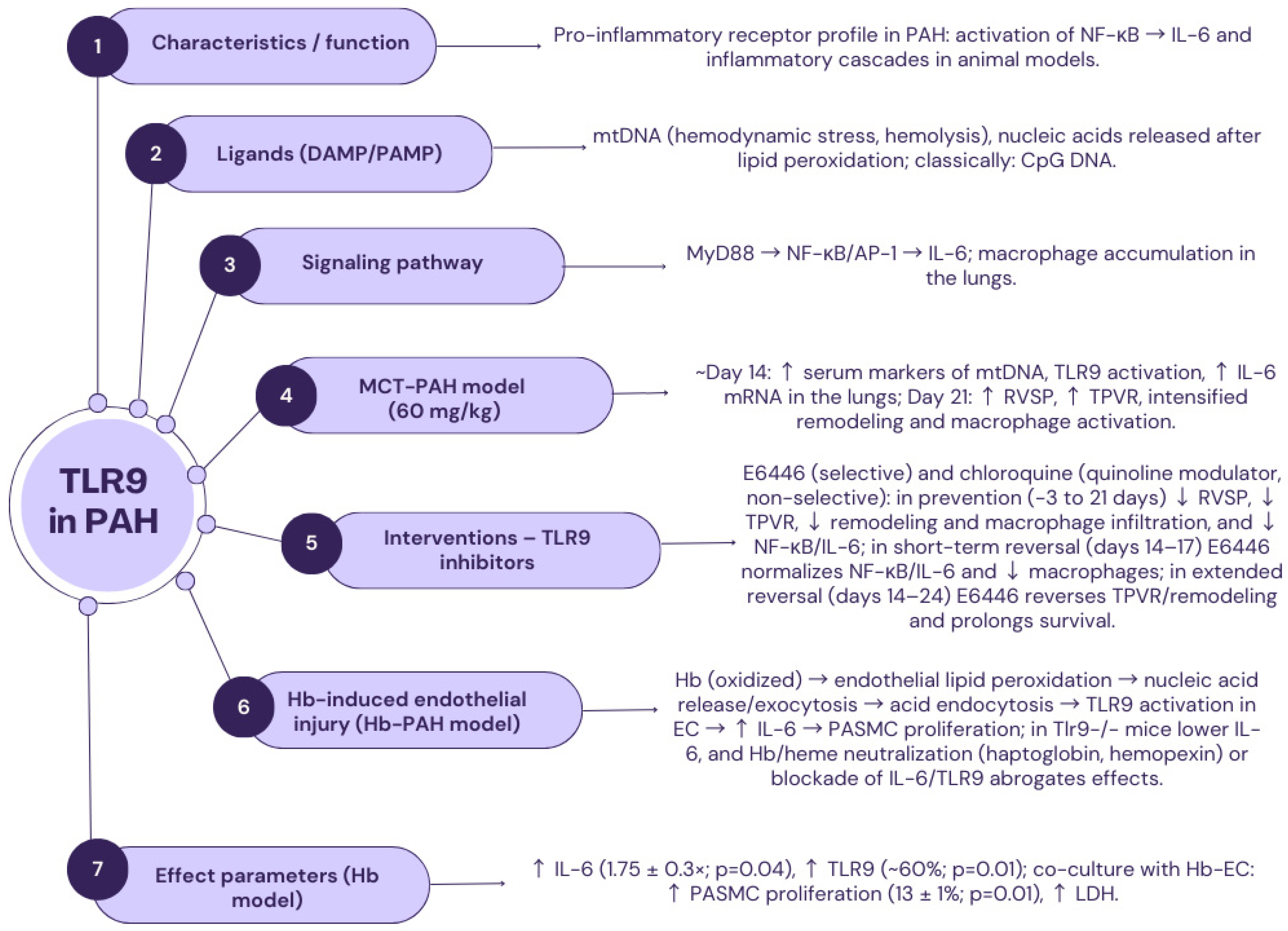 | Implications for PAH | Potential pro-inflammatory and pro-remodeling role; requires verification in in vivo/in vitro studies. | Potential therapeutic target: antagonism of signaling via the TLR2/6 → NF-κB axis to reduce inflammation and remodeling. |