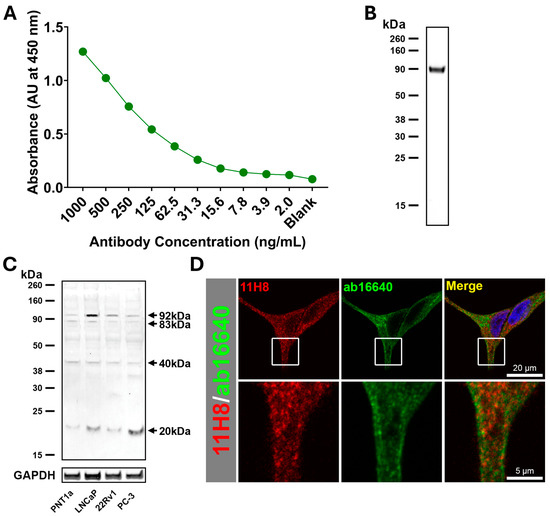 The monoclonal antibody 11H8 (IgG2b) was generated against a specific peptide motif, LANNTHQHVFDDLRG, contained in the sortilin protein sequence. Genscript adhered to ISO 9001 standard reagent production with full independent peptide and protein ELISA specificity and Western blotting defined against peptide and recombinant protein (representative ELISA and Western blotting against recombinant protein in Figure 1A,B, respectively). A BLAST-search (BLAST+ 2.14.0) analysis based on a six-amino acid sequence identity comparison was conducted to identify any proteins with a common sequence that may potentially interact with the anti-sortilin antibody generated against this peptide, but none were identified. On prostate cell extracts, the monoclonal antibody 11H8 detected proteins at approximately 92, 83, 40 and 20 kDa, and there was qualitative evidence of higher expression of the 92 kDa and 20 kDa molecular forms in prostate cancer cells (LNCaP, 22RV1 and PC-3) compared to non-malignant cell extracts (PNT1a) (Figure 1C). Immunofluorescence colocalization was performed with Alexa Fluor 647-conjugated 11H8 monoclonal antibody and compared to a knockout validated commercial sortilin polyclonal antibody (ab16640) using a secondary Donkey anti-Rabbit IgG Alexa Fluor 488 conjugate (Figure 1D). The antibody 11H8 exhibited a pattern of punctate labelling, and spatial correlation analysis revealing that there was moderate colocalization with the commercial sortilin polyclonal antibody, as evidenced by an average Pearson correlation coefficient of 0.69.