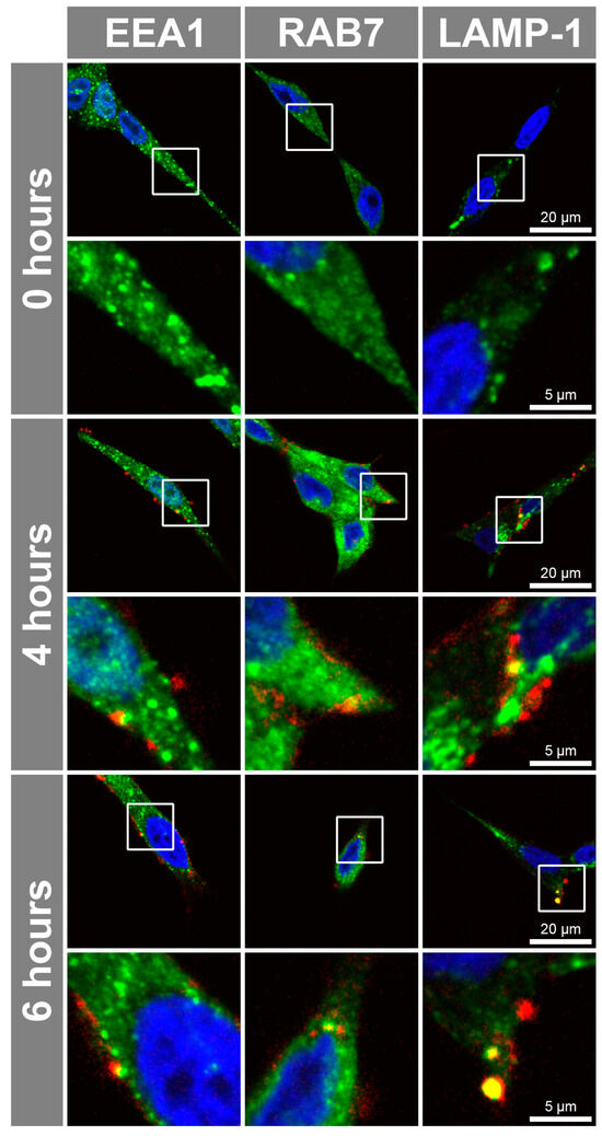 Endosome-lysosome uptake of anti-sortilin monoclonal antibody 11H8. Alexa Fluor® 647-conjugated 11H8 monoclonal antibody uptake in LNCaP cells at 0, 4 and 6 h with EEA1, Rab7 and LAMP-1 labelled endosomes-lysosomes (green), 11H8 (red) and nuclei (blue), with compartment colocalization (yellow). A cropped and 4× enlarged area (below) is indicated by white box. Representative confocal micrographs from n = 5 replicates.