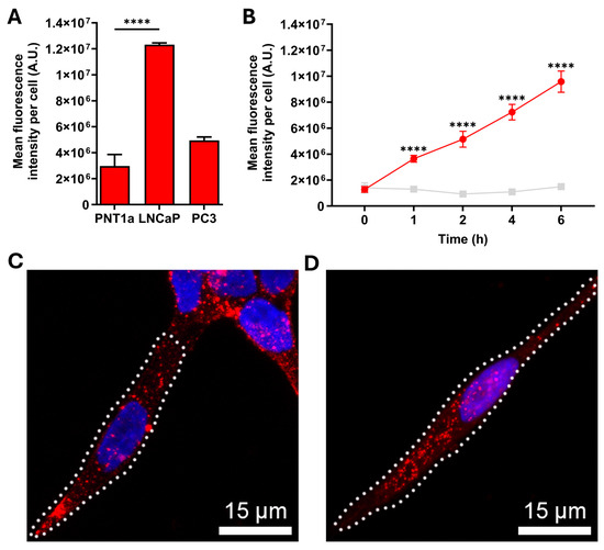 Cellular uptake and internalization of anti-syndecan-1 monoclonal antibody 6D11. (A) Alexa Fluor® 647-conjugated anti-syndecan-1 monoclonal antibody 6D11 internalization by PNT1a non-malignant and LNCaP and PC-3 malignant prostate cell lines after 6 h (one-way ANOVA using Dunnett’s multiple comparison n = 3, **** p < 0.0001; error bars represent the SEM). (B) Alexa Fluor® 647-conjugated 6D11 (red dots) or IgG2b isotype control (ab18421; grey dots) internalization by LNCaP cells at 1, 2, 4, and 6 h. Antibody internalization was measured as mean fluorescence intensity and represents three individual experiments (unpaired t-test, **** p < 0.0001; error bars represent the SEM). (C,D) Representative maximum-intensity projections of confocal micrographs of sortilin antibody uptake in LNCaP cells captured using live cells (C) or fixed and permeabilized cells (D) labelled with Alexa Fluor® 647-conjugated 6D11 antibody (red) and Hoechst 33,342 to counterstain the cell nuclei (blue).
