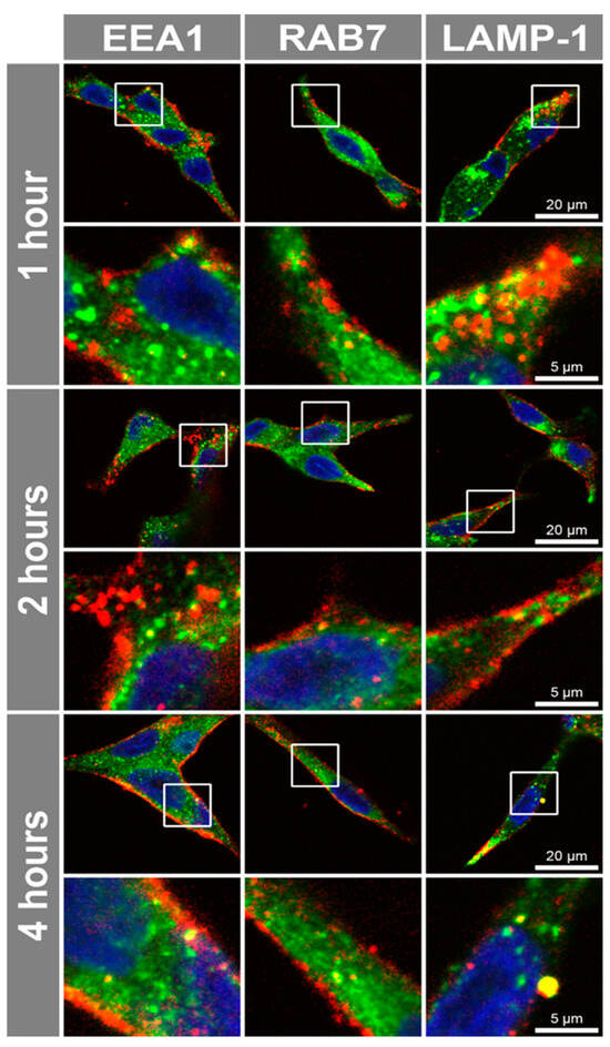 Antibody internalization via endocytosis is a crucial aspect for the development of antibody therapeutics, as it ensures the effective delivery of antibody to its intracellular target [35]. To investigate antibody internalization via cell surface receptors, live prostate cells were incubated with Alexa Fluor® 647-conjugated sortilin monoclonal antibody. There was a significant increase in the 11H8 monoclonal antibody fluorescence in LNCaP compared to both PNT1a and PC-3 cells, following a 6 h incubation (Figure 2A). To confirm the specificity and time course for the internalization of the 11H8 monoclonal antibody, LNCaP cells were incubated with either Alexa Fluor® 647-conjugated 11H8 monoclonal antibody or an isotype control, over a 6 h time course (Figure 2B). The endocytosis of 11H8-bound sortilin exhibited a progressive increase in intensity, with a significant increase in fluorescence signal observed after 4 and 6 h incubation, compared to the isotype control that did not show any significant uptake at these time points (p < 0.01; Figure 2B). To assess the uptake capacity via cell surface receptors, live LNCaP cells were incubated with the 11H8 monoclonal antibody and compared to fixed permeabilized cells. Live cell uptake revealed similar punctate labelling but with reduced numbers of vesicles in the live cell experiments (Figure 2C) compared to the fixed/permeabilized cells (Figure 2D), indicating a possible difference between cell surface availability of sortilin versus the total intracellular pool. There was evidence of Alexa Fluor® 647-conjugated 11H8 monoclonal antibody delivery to EEA1 early endosomes, Rab7 late endosomes, and LAMP-1 endosomes-lysosomes after 4–6 h incubation on live LNCaP cells, indicating delivery to endocytic compartments (Figure 3). However, there were compartments that appeared to be labelled with Alexa Fluor® 647-conjugated 11H8 monoclonal antibody, but not co-locating with EEA1, Rab7 and LAMP-1, suggesting delivery to other endosome-lysosome compartments.