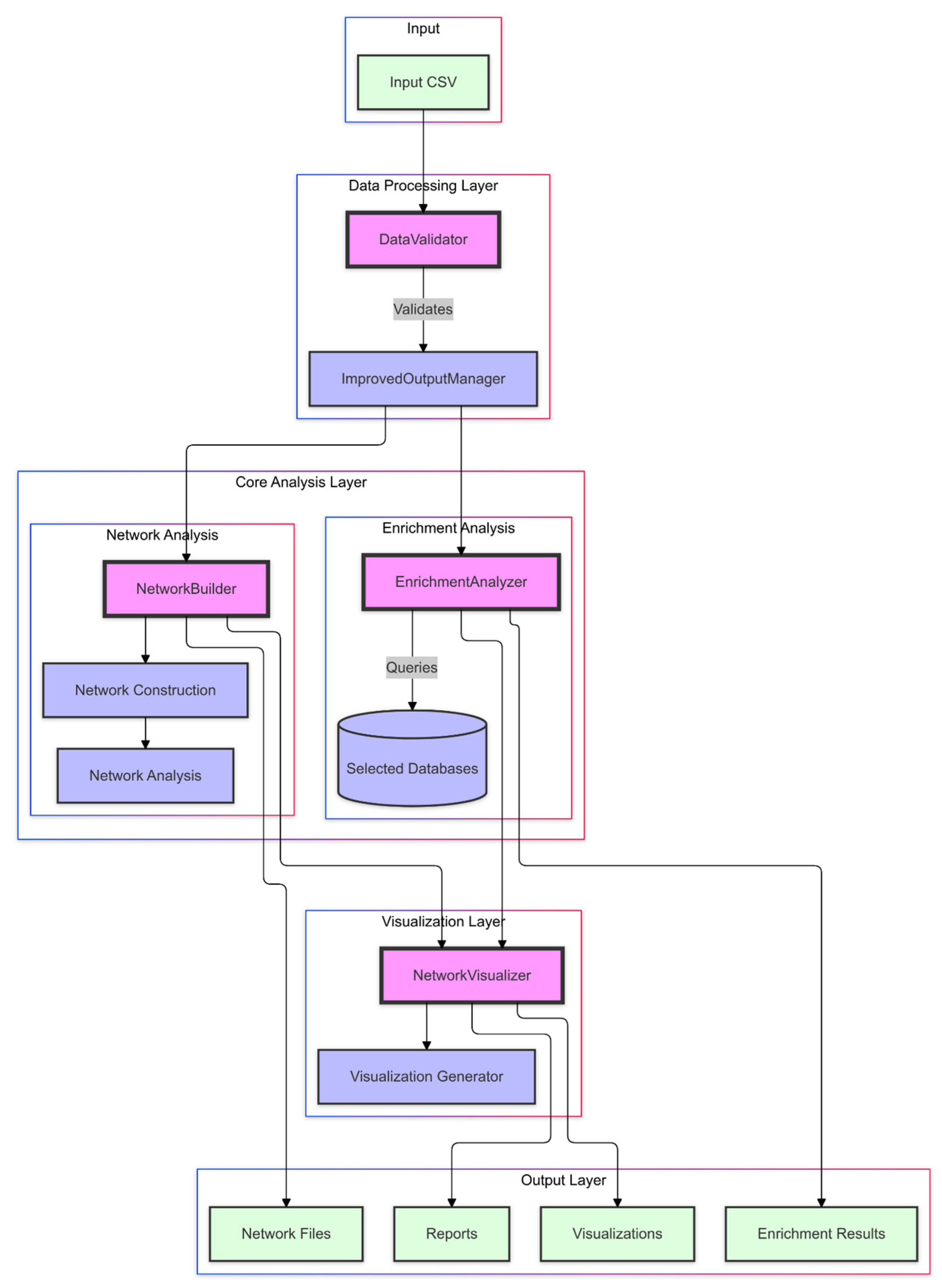 The visualization layer, through the NetworkVisualizer component, generates publication-quality figures (300 DPI) with parameters optimized based on network complexity, supporting multiple output formats, including network diagrams and enrichment heatmaps. Finally, the output layer, managed by the ImprovedOutputManager, implements systematic result organization through hierarchical structures, comprehensive reports, and detailed logging. This architecture ensures reproducibility and facilitates result interpretation through standardized formats and thorough documentation.