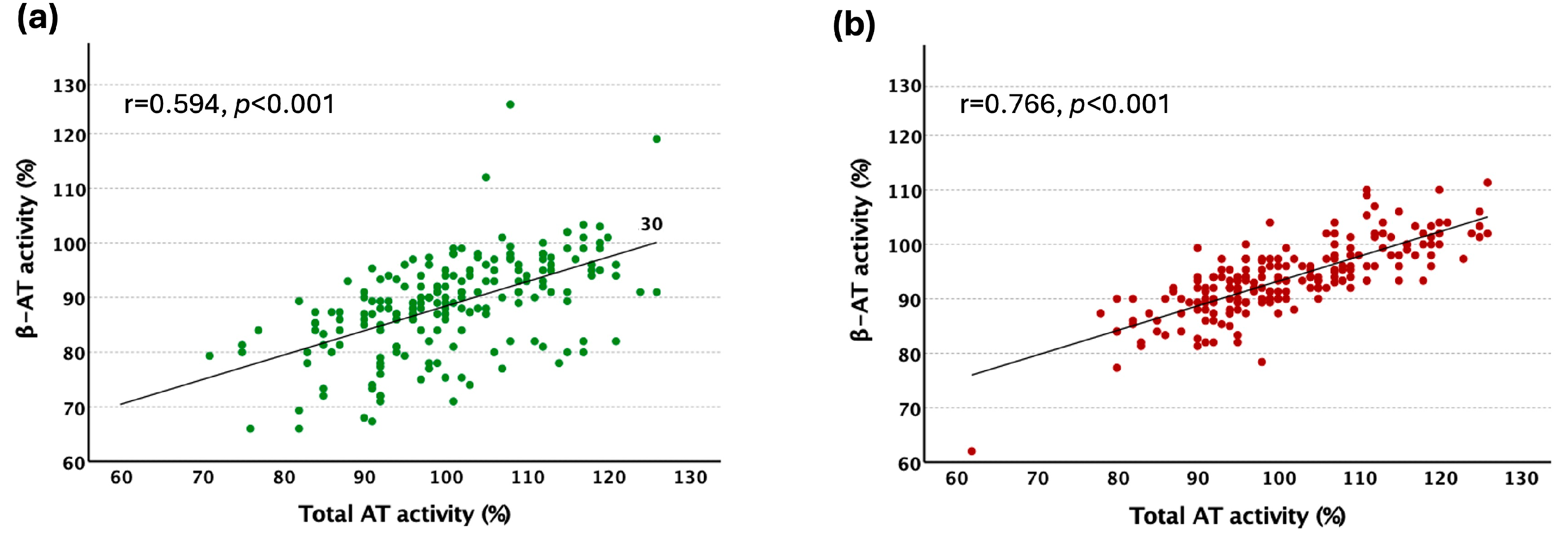 | Ratio of β-AT within total AT (%) (50/50 vs. 89/12) | 6.147 | 3.362–11.240 | <0.001 |