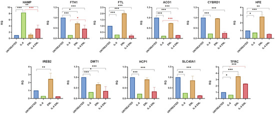 Gene expression analysis of iron metabolism following ENL treatment. Cells were exposed to inflammatory stimulus and treated with ENL. The graphs show gene expression levels measured by real-time PCR. Data are presented as relative quantification (RQ), normalized to the housekeeping gene β-tubulin, and expressed relative to untreated controls. Statistical significance is indicated as follows: * p < 0.05, ** p < 0.01, *** p < 0.001. The black color is associated for the comparison of Untreated vs. IL-6+ENL and red one for IL-6 vs. IL-6+ENL.