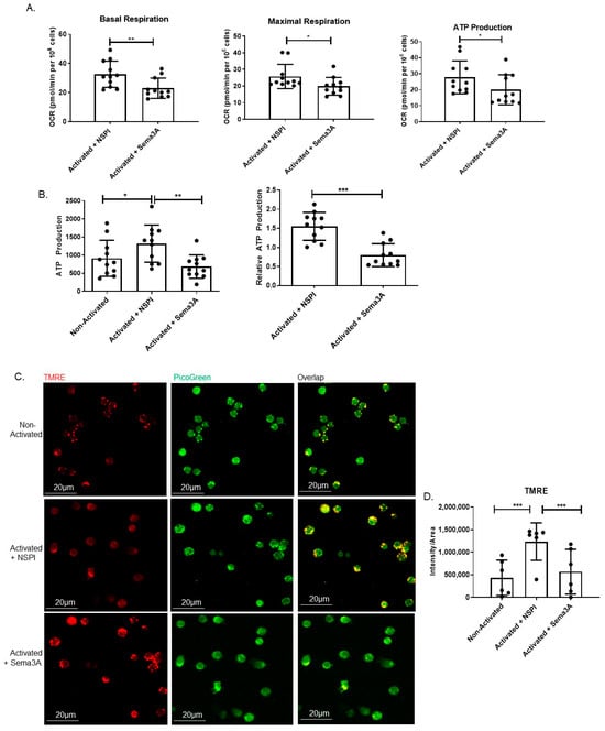 Sema3A downregulates OXPHOS and mitochondrial membrane potential. (A) Shows the measurement of three parameters: basal and maximal respiration as well as ATP production. Results were obtained from 11 healthy donors. (B) Measuring ATP production using an ATP determination kit after 12 h of activation. Results were obtained from 11 healthy donors. (C) Mitochondrial staining using TMRE is seen in red, and double-stranded DNA staining using PicoGreen is seen in green. Yellow is the overlap between red and green. Images were captured using a 60× oil objective lens. Scale bar = 20 µm (D) Statistical analysis of fluorescence intensity/area was obtained from 200 cells per group from 6 healthy donors. Mann–Whitney and Kruskal–Wallis tests. p value * < 0.05, ** < 0.005, *** < 0.0005.