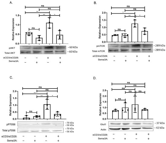 The major question of how do cells sense and adapt to the nutrients available in their environment remains somewhat incompletely understood. What is known is that one key pathway is the signaling pathway anchored by mTORC1 kinase []. Since our results show that Sema3A downregulated glucose consumption and negatively affected DHAP levels in activated T cells, we investigated Sema3A’s effect on the intracellular signaling pathway of PI3K/AKT/mTORC1 and whether it directly affects mTORC1 activity. We used specific antibodies directed to the phosphorylated forms of mTORC1, AKT, and ribosomal S6 kinase (pS6K), a downstream target of mTORC1 that plays a key role in regulating cell growth by controlling the translation and biosynthesis of proteins []. Purified T cells from healthy donors were divided into four groups, two unstimulated groups and two activated groups, and each subgroup was treated either with purified Sema3A or elution buffer (EB). Our results showed that activated T cells upregulate the phosphorylation of AKT, mTORC1, and its downstream target pS6K in comparison with unstimulated T cells. However, Sema3A significantly downregulated the phosphorylation of all three molecules of the signaling pathway, indicating that Sema3A does not affect mTORC1 solely but rather has a more upstream effect. The most surprising result was that Sema3A reduces the expression levels of Glut-1; however, the reduction was not statistically significant (Figure 4A–D).