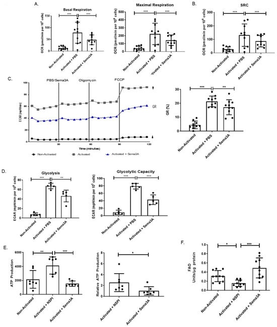Another important parameter to measure is called “spare respiratory capacity” (SRC). SRC characterizes the extra mitochondrial capacity available in a cell to produce energy in response to acute cellular stress or increased workload, thereby avoiding an ATP crisis [,]. When measured, we showed that upon activation there was a significant increase in the SRC when compared with unstimulated T cells. Such an increase was not detected in activated T cells that were treated with Sema3A (Figure 5B). Looking at the GR and comparing between activated and unstimulated T cells, we show that activated cells have significantly higher GR, whereas Sema3A-treated cells demonstrate significantly decreased GR in comparison to the control counterparts (Figure 5C). Taken together, these results prove that Sema3A not only negatively affects OXPHOS but also negatively affects the cell’s ability to produce energy if the need arises, and that it may also inhibit glycolysis in activated T cells taken from RA patients.