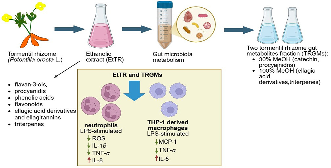 3]. These findings support the emerging concept that hydrolyzable tannins from tormentil rhizome act as precursors of bioactive postbiotic metabolites capable of fine-tuning innate immune responses rather than exerting uniform suppression. Collectively, the study provides mechanistic evidence that tormentil rhizome and its microbiota-derived metabolites can modulate oxidative and inflammatory pathways in innate immune cells through complementary redox and signaling mechanisms. Such properties underline the potential of tormentil rhizome as a source of functional ingredients for the prevention or management of inflammation-related intestinal and systemic disorders.