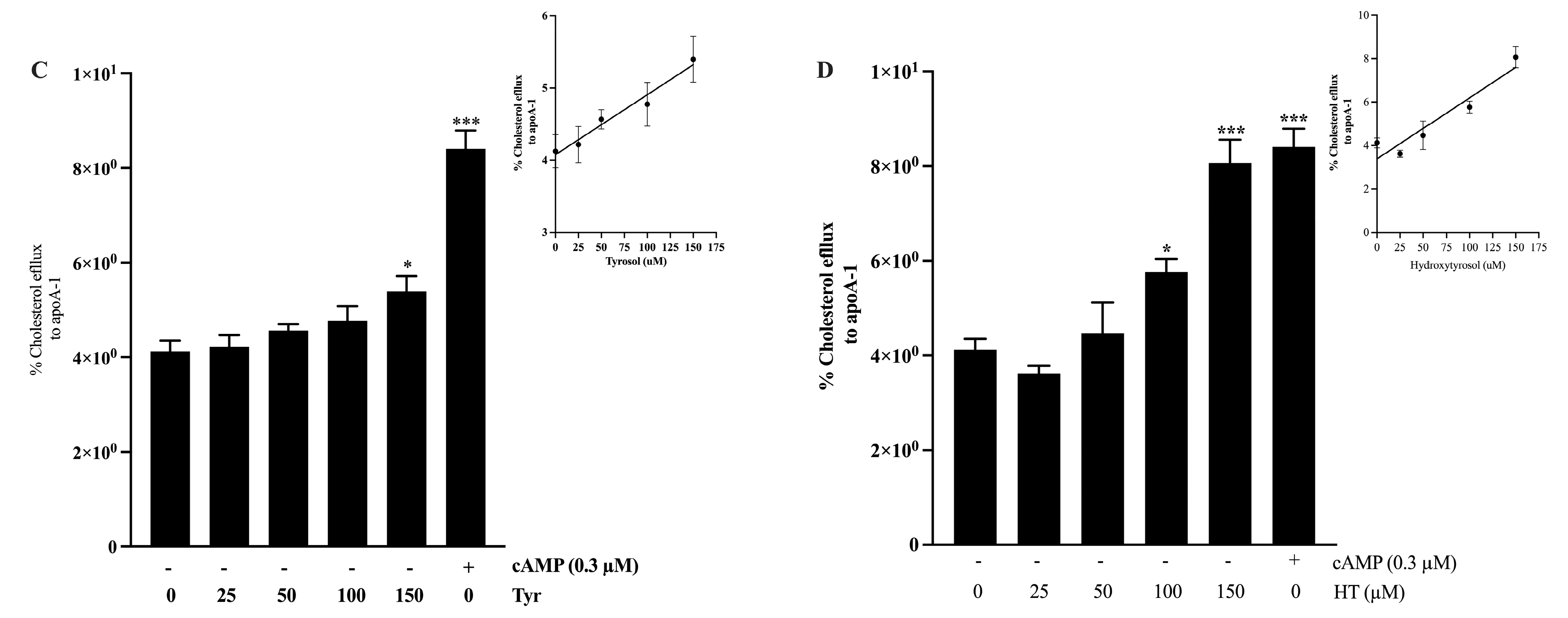- Franceschelli, S.; De Cecco, F.; Pesce, M.; Ripari, P.; Guagnano, M.T.; Nuevo, A.B.; Grilli, A.; Sancilio, S.; Speranza, L. Hydroxytyrosol Reduces Foam Cell Formation and Endothelial Inflammation Regulating the PPARγ/LXRα/ABCA1 Pathway. Int. J. Mol. Sci. 2023, 24, 2057. [Google Scholar] [CrossRef] [PubMed]