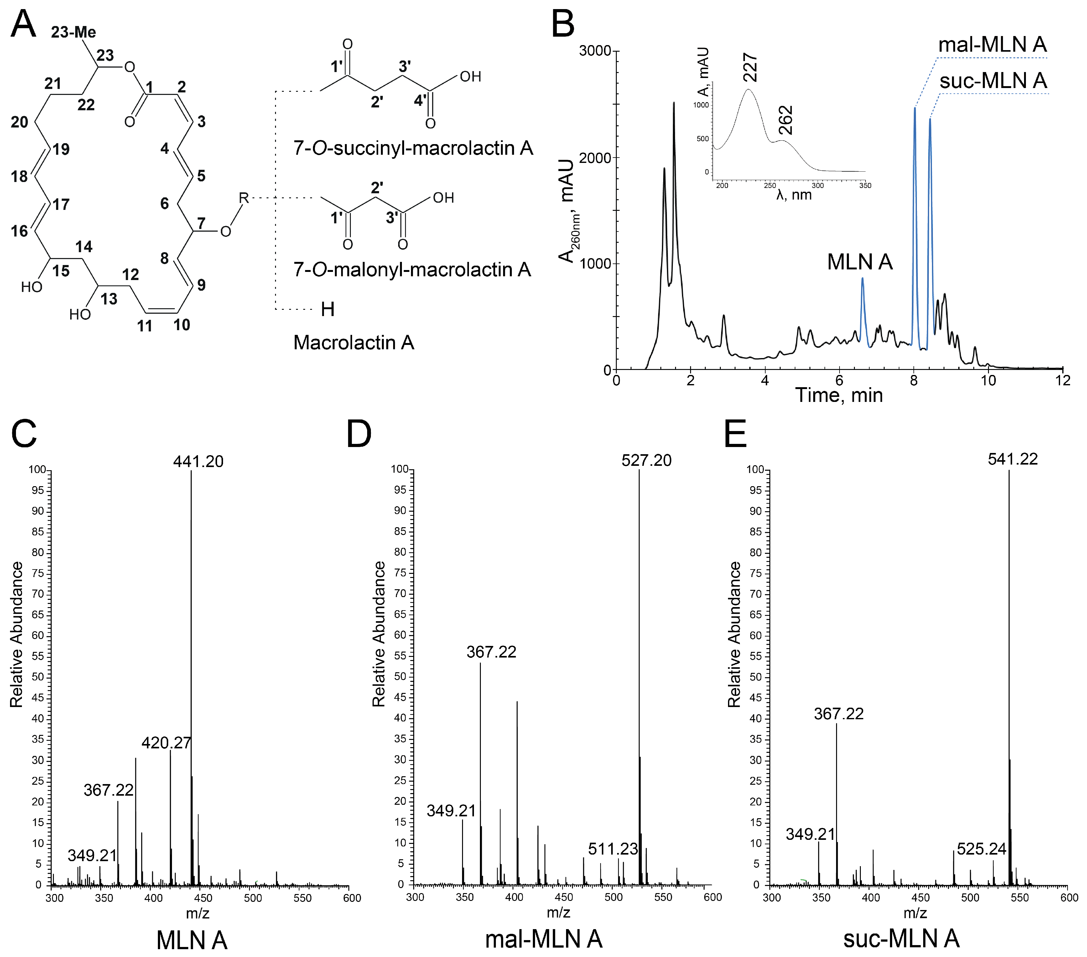 - Schneider, K.; Chen, X.-H.; Vater, J.; Franke, P.; Nicholson, G.; Borriss, R.; Süssmuth, R.D. Macrolactin Is the Polyketide Biosynthesis Product of the Pks2 Cluster of Bacillus Amyloliquefaciens FZB42. J. Nat. Prod. 2007, 70, 1417–1423. [Google Scholar] [CrossRef] [PubMed]