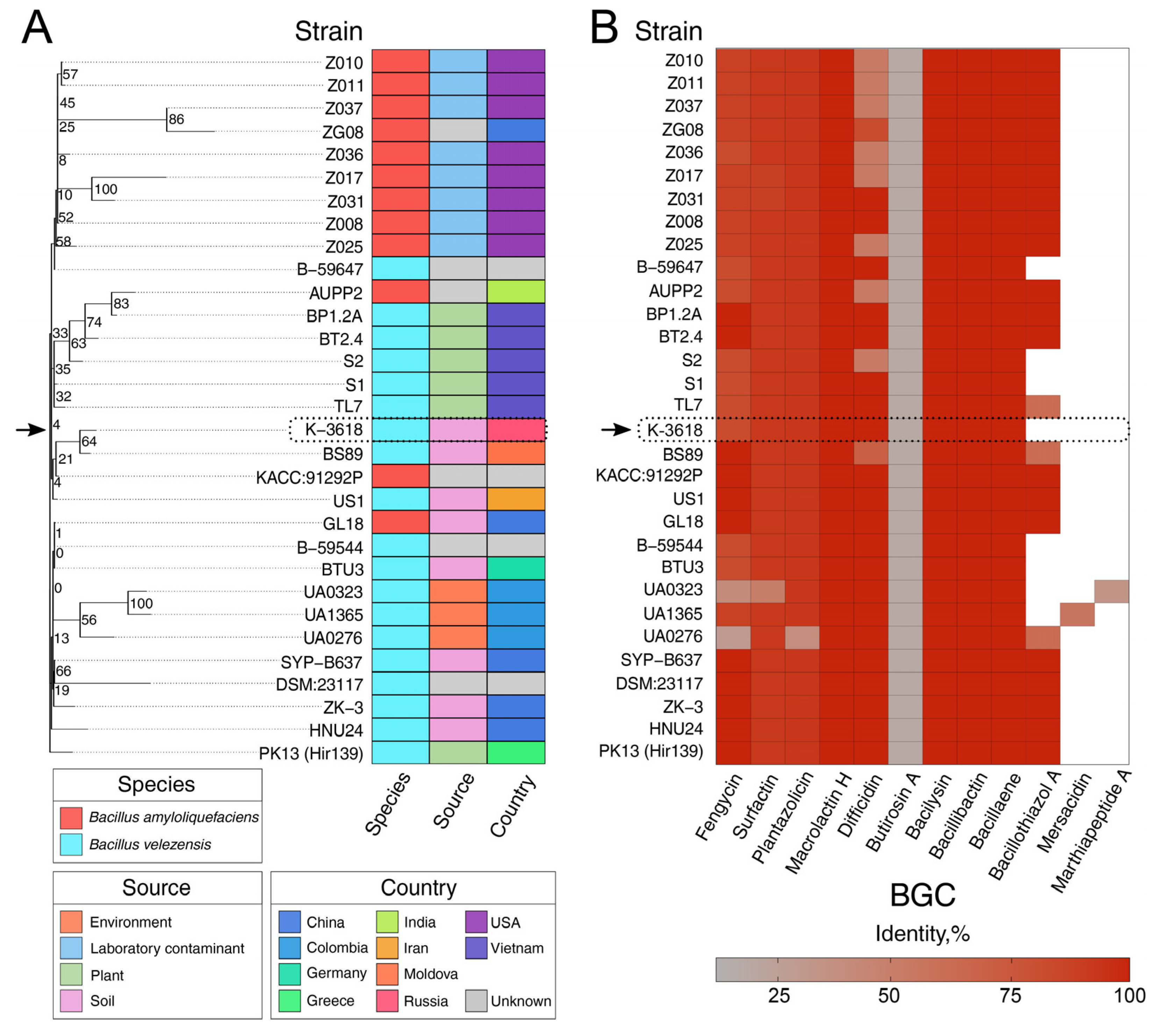 2.5. MLN Biosynthetic Gene Cluster Is Highly Abundant in Bacillus velezensis and Bacillus amyloliquefaciens Species