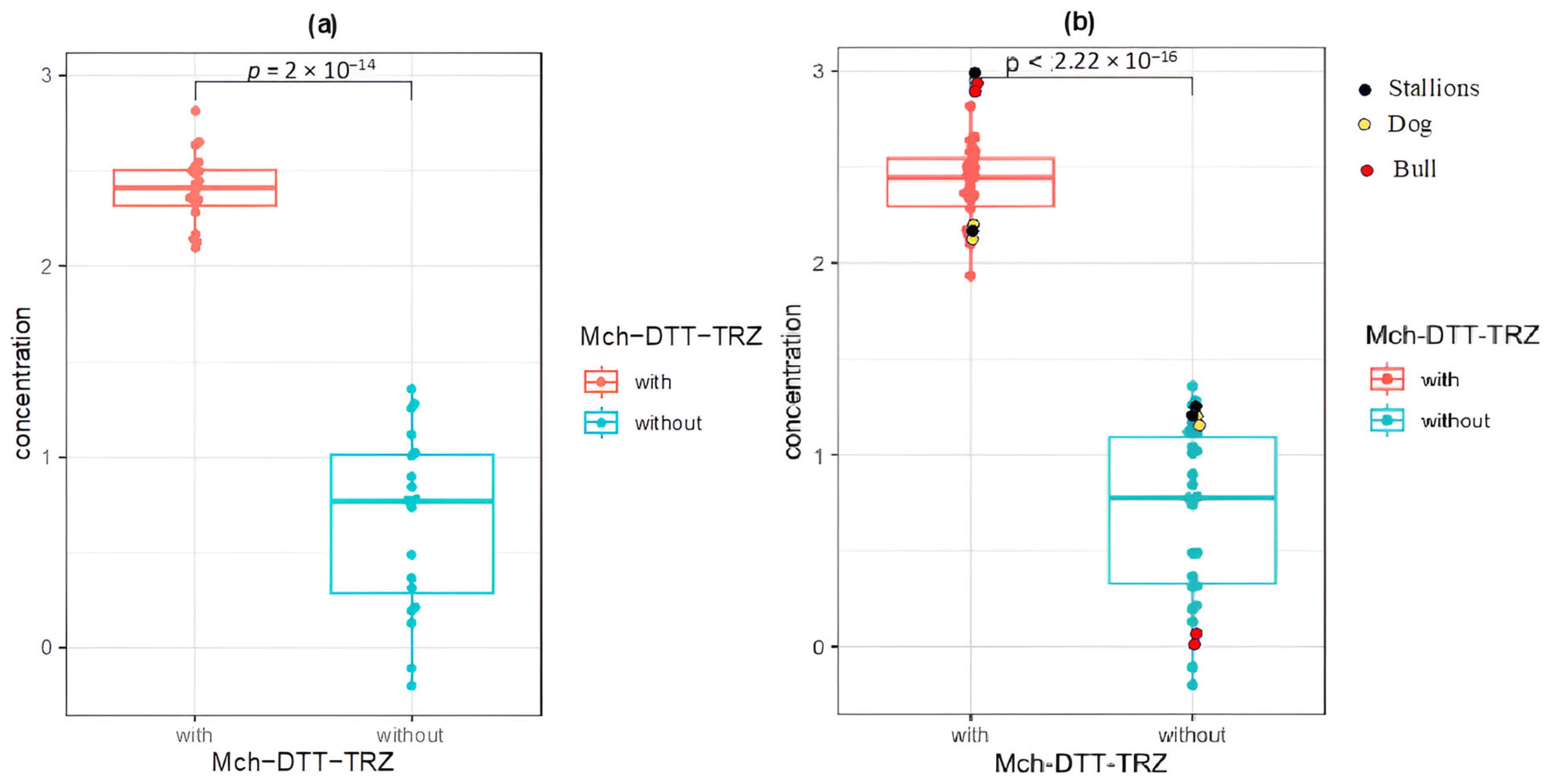 - Navarrete-López, P.; Asselstine, V.; Maroto, M.; Lombó, M.; Cánovas, Á.; Gutiérrez-Adán, A. RNA sequencing of sperm from healthy cattle and horses reveals the presence of a large bacterial population. Curr. Issues Mol. Biol. 2024, 46, 10430–10443. [Google Scholar] [CrossRef]