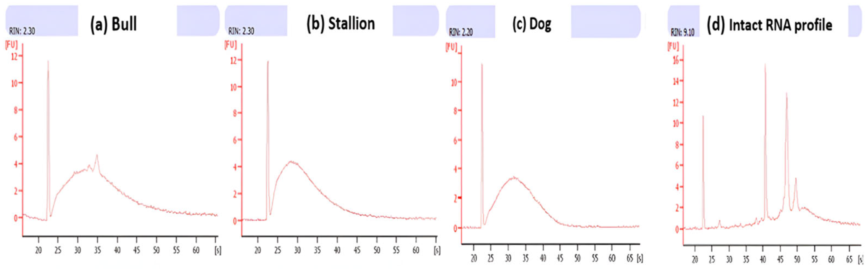 - Dewry, R.K.; Mohanty, T.K.; Nath, S.; Bhakat, M.; Yadav, H.P.; Baithalu, R.K. Comparative RNA isolation methods from fresh ejaculated spermatozoa in Sahiwal cattle (Bos indicus) and Murrah buffalo (Bubalus bubalis) bulls for high quality and enhanced RNA yield. Anim. Biotechnol. 2023, 34, 5180–5191. [Google Scholar] [CrossRef] [PubMed]