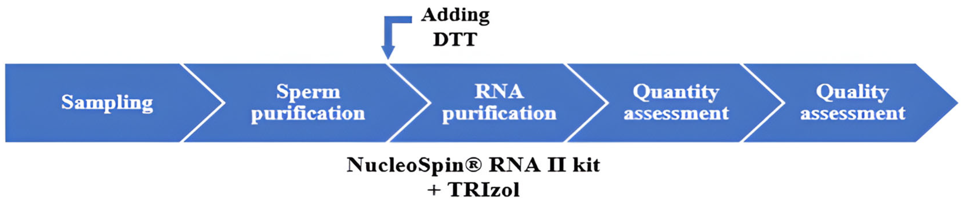 - El Fekih, S.; Nguyen, M.-H.; Perrin, A.; Beauvillard, D.; Morel, F.; Saad, A.; Ben Ali, H.; De Braekeleer, M. Sperm RNA preparation for transcriptomic analysis: Review of the techniques and personal experience. Andrologia 2017, 49, e12767. [Google Scholar] [CrossRef]