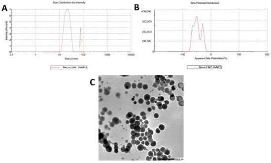 (A) Zeta size, (B) zeta potential, and (C) TEM of selenium nanoparticles showing successful preparation (Scale bar = 200 nm).