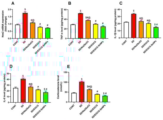 Selenium selenite, EGCG, and EGCG-SeNPs altered (A) NOS2 gene expression, (B) TNF-α, (C) IL-1β, (D) IL-6, and (E) corticosterone in sleep deprivation-subjected rats. In each group, n = 8 and data are represented as mean ± SEM; one way analysis of variance (ANOVA) was performed, followed by Tukey’s multiple comparison post hoc test to evaluate intergroup differences. $ Significant to the normal control group; # significant to sleep deprivation group; @ significant to EGCG-SeNPs.