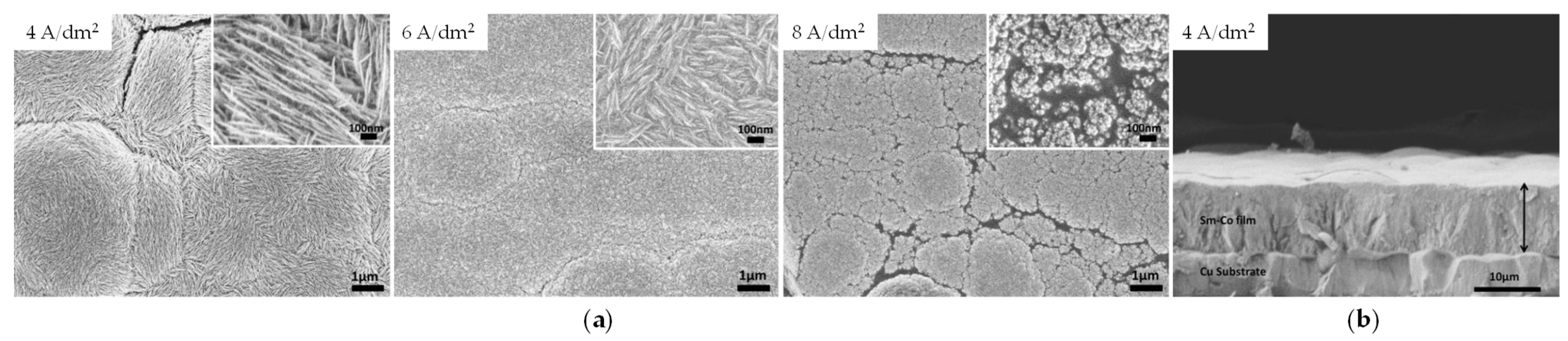 | Sm(NH2SO3)3, 0.1M CoSO4, 0.3M C2H5NO2, 0.5M H3BO3; pH 2.5 | PD: −1.6 to −2.1 V vs. Ag/AgCl, 5 or 35 °C | 5–40 at% Sm; film, amorphous: Sm2Co17 after annealing | [120] |