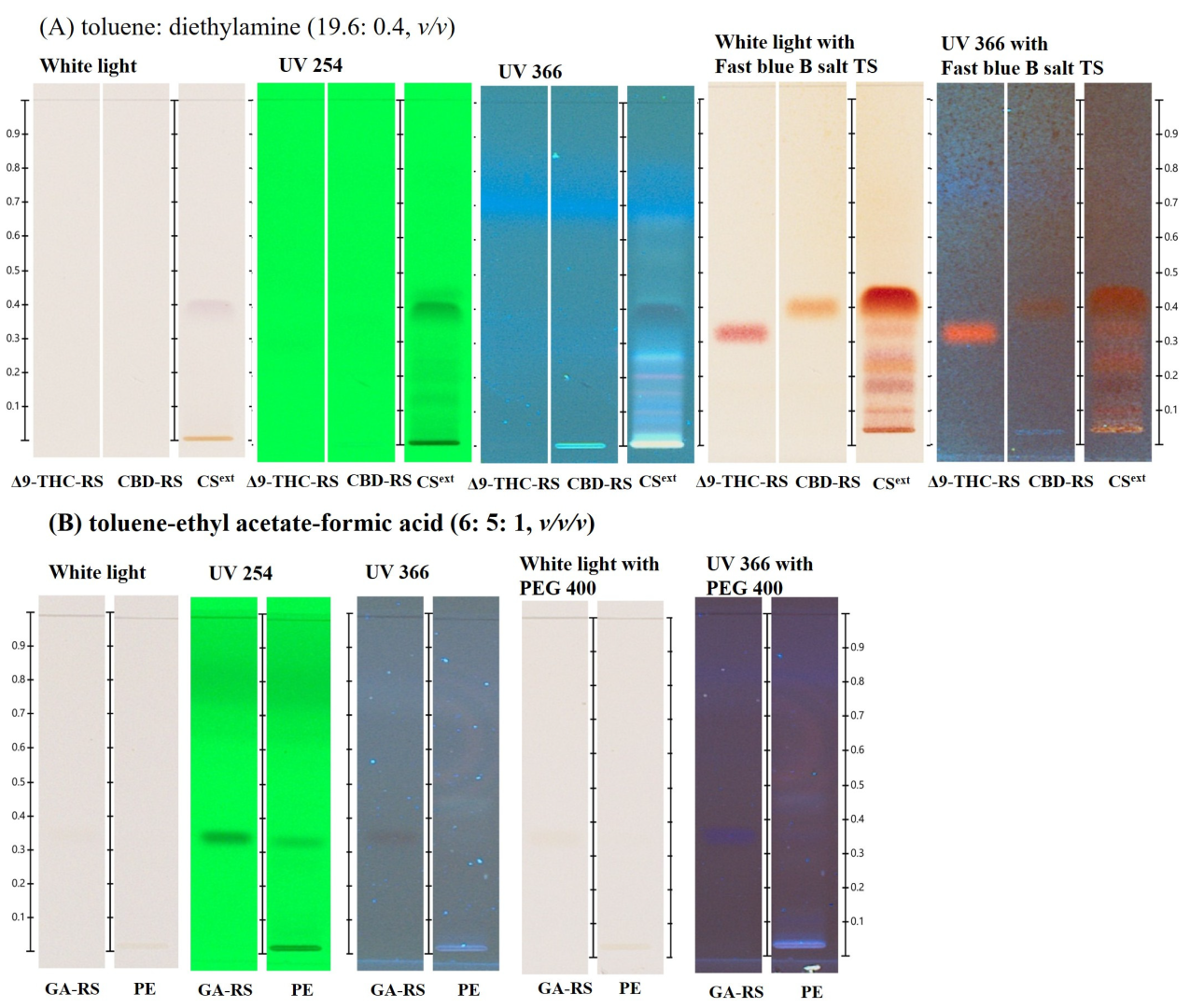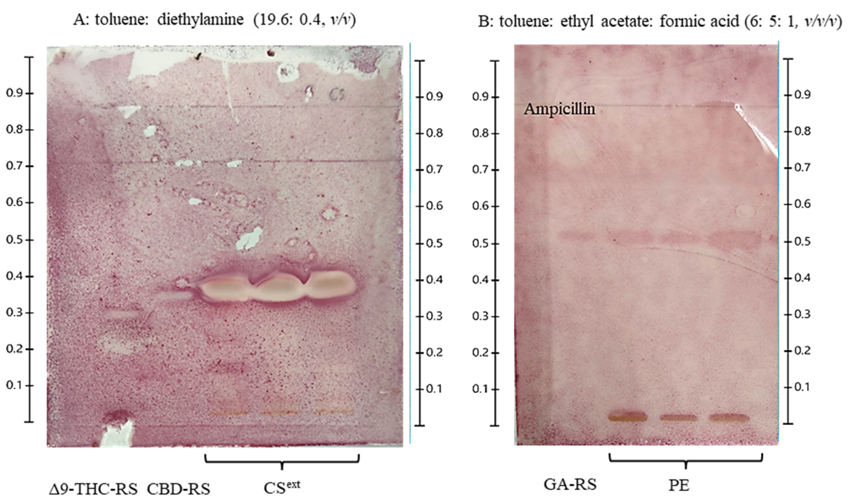 - The International Association for the Advancement of High Performance Thin Layer Chromatography (HPTLC Association). Cannabis (Cannabis sativa)—Normal Phase Separation; The International Association for the Advancement of HPTLC: Zurich, Switzerland, 2017; pp. 1–2. [Google Scholar]