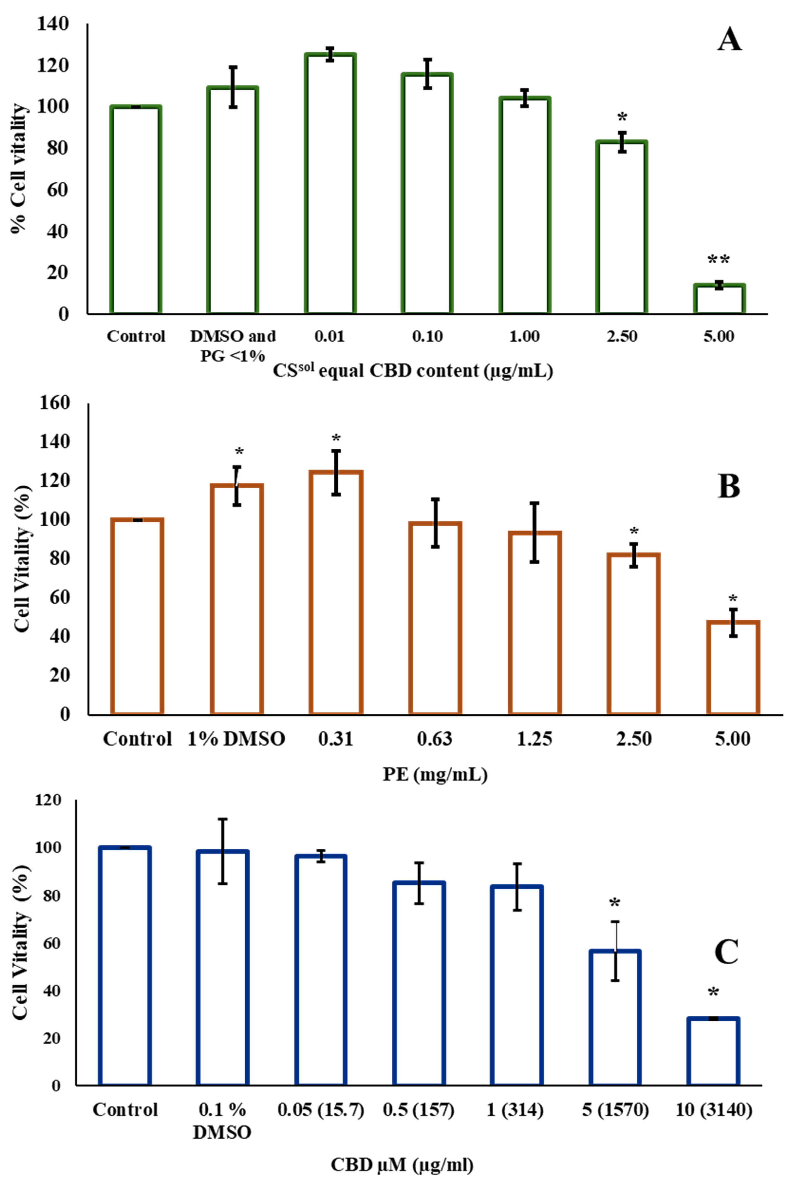 | Microorganisms | PEsol (% v/v) | CSsol Eq. to CBD (µg/mL) | ||