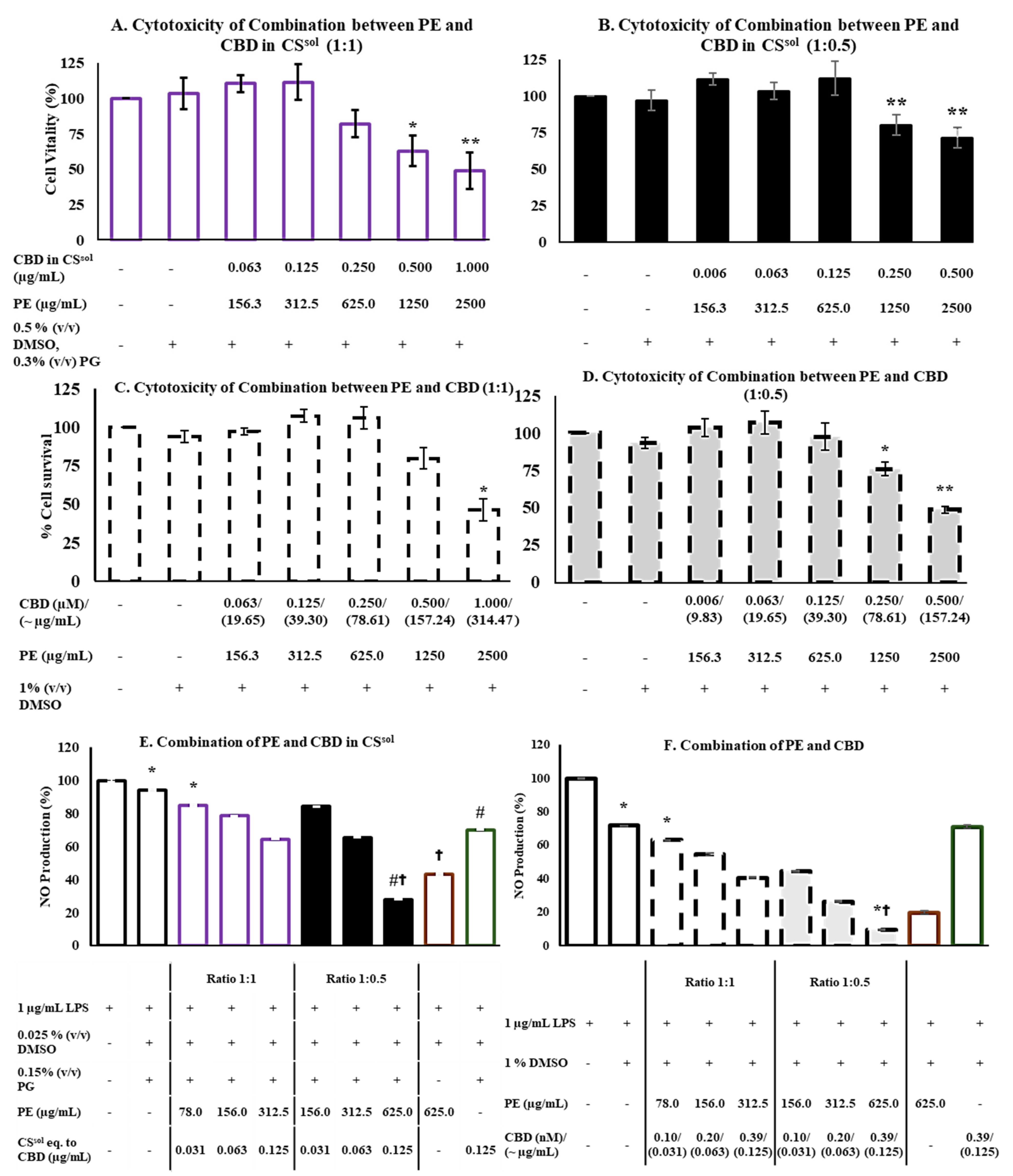 2.5. CS and PE Combination Significantly Reduced NO Production and Suppressed the Release of Proinflammatory Cytokines