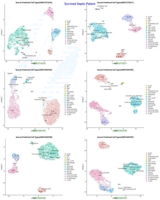 UMAP representation of cell types in Survived Septic Patients, highlighting shifts in immune cell populations post-sepsis recovery (HSC-G-CSF, macrophages, neutrophils, and activated T cells, indicating immune recovery and adaptation).