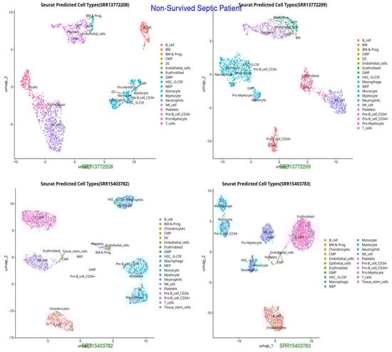 UMAP representation of cell types in Non-Survived Septic Patients, indicating distinct clustering patterns and potential immune dysregulation (HSC-G-CSF, pro-myelocytes), excessive neutrophil activation, and potential endothelial dysfunction, reflecting immune failure and systemic inflammation.